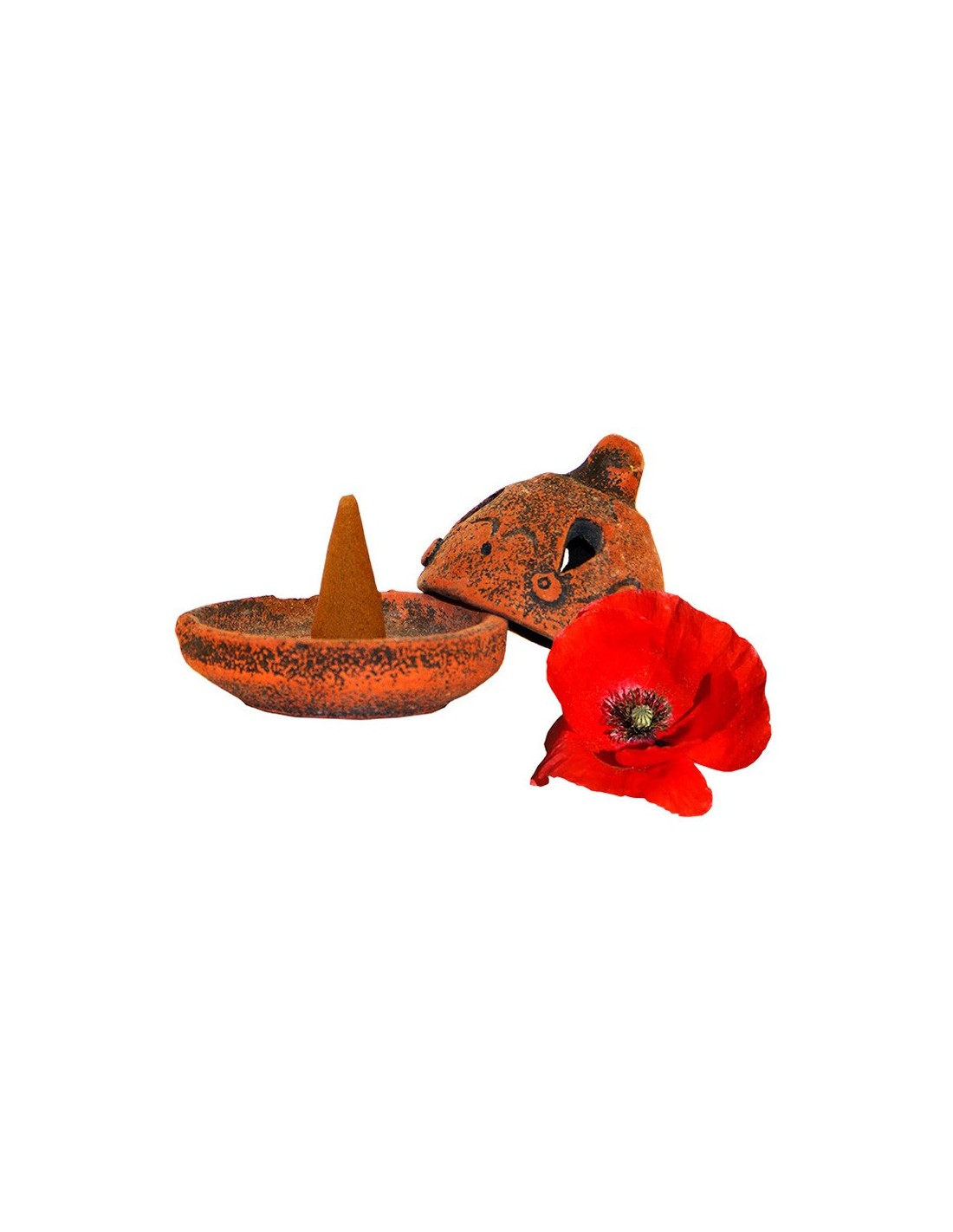 Dieser Räucherkegel-Halter wurde von Handwerkern in Terrakotta handgefertigt. Dazu gibt es zehn Räucherkegel mit dem Duft von Opium. Sie finden in der Schachtel auch ein kleines dekoratives Holz, das mit dem Weihrauch verbrannt werden kann.