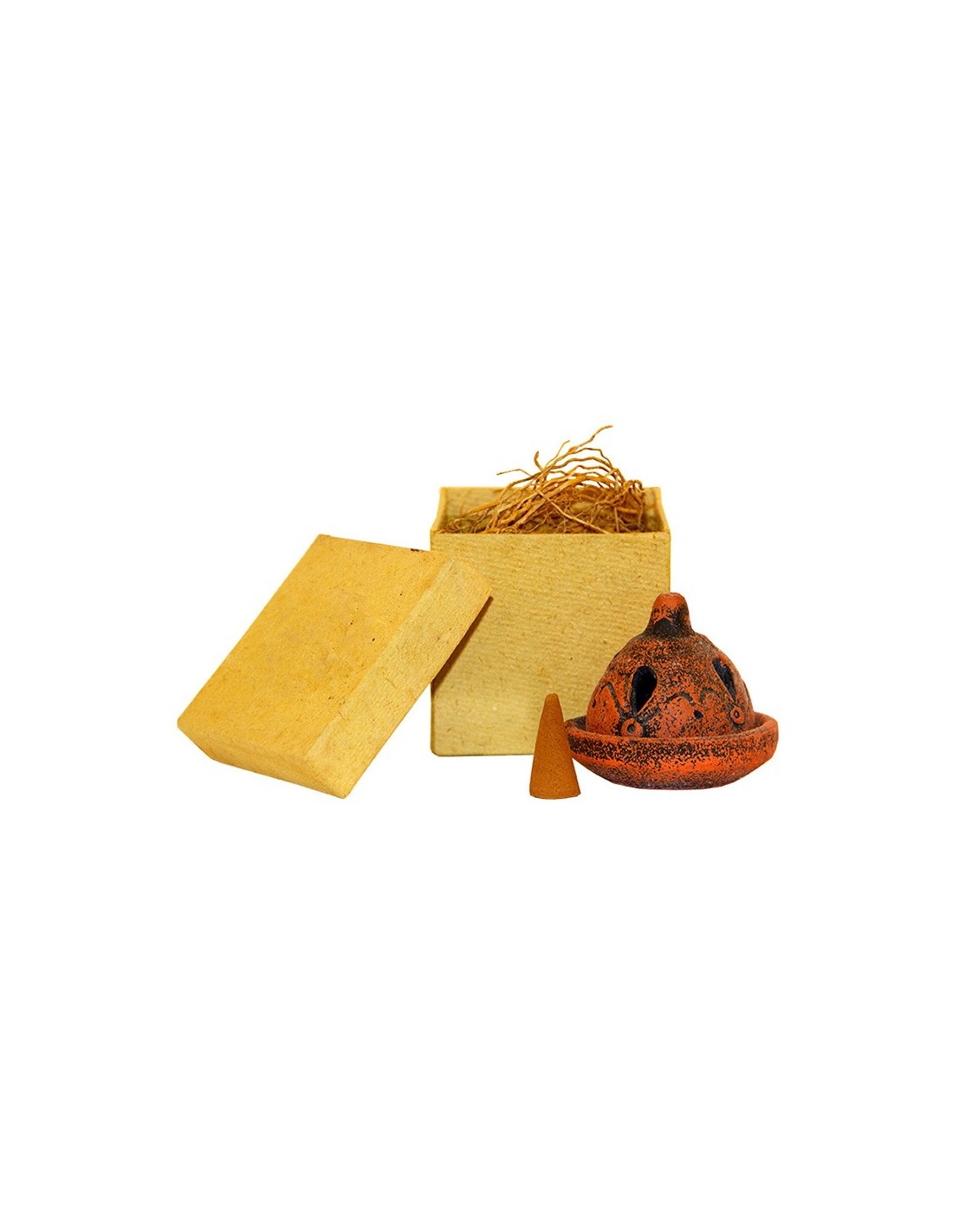Schachtel mit 10 Räucherkegeln mit süßem balinesischem Duft, berauschend und süß, und einem Halter, um den Kegel zu schützen und zu verbrennen. Handgefertigter Terrakotta-Halter.
