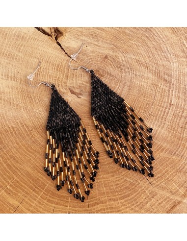 Gold miyuki beads long earrings with white and black variations. Diamond shaped, the pearl strands flare out and hang freely, evoking feathers.