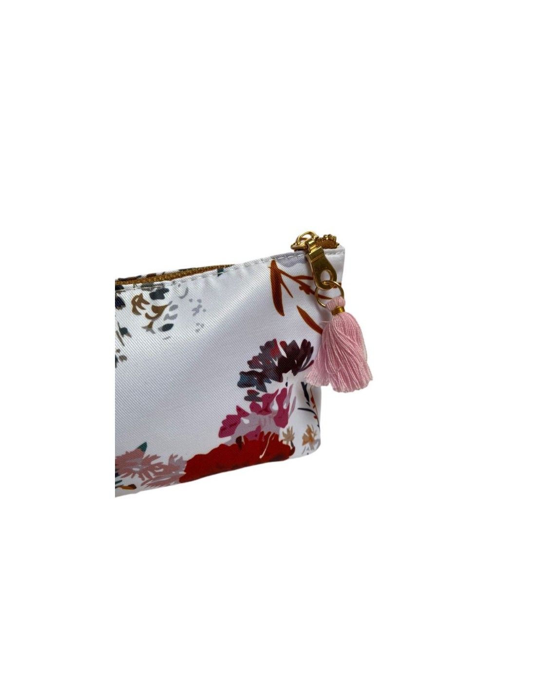 Storage pouch for bottles of essential oils, with pretty, delicate and colorful floral patterns, and adorned with a small pink pompom, with zipper.