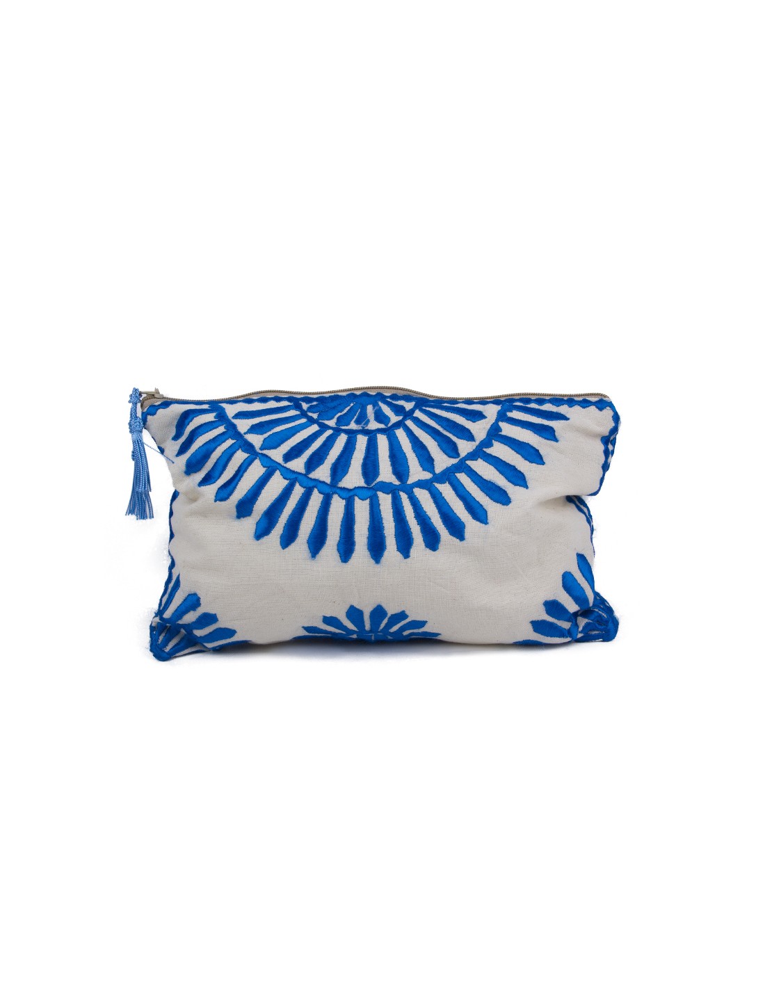 The royal blue embroideries form flowers or mandalas on the corners of the pouch but also on the center, accompanied by a framing pattern all around.