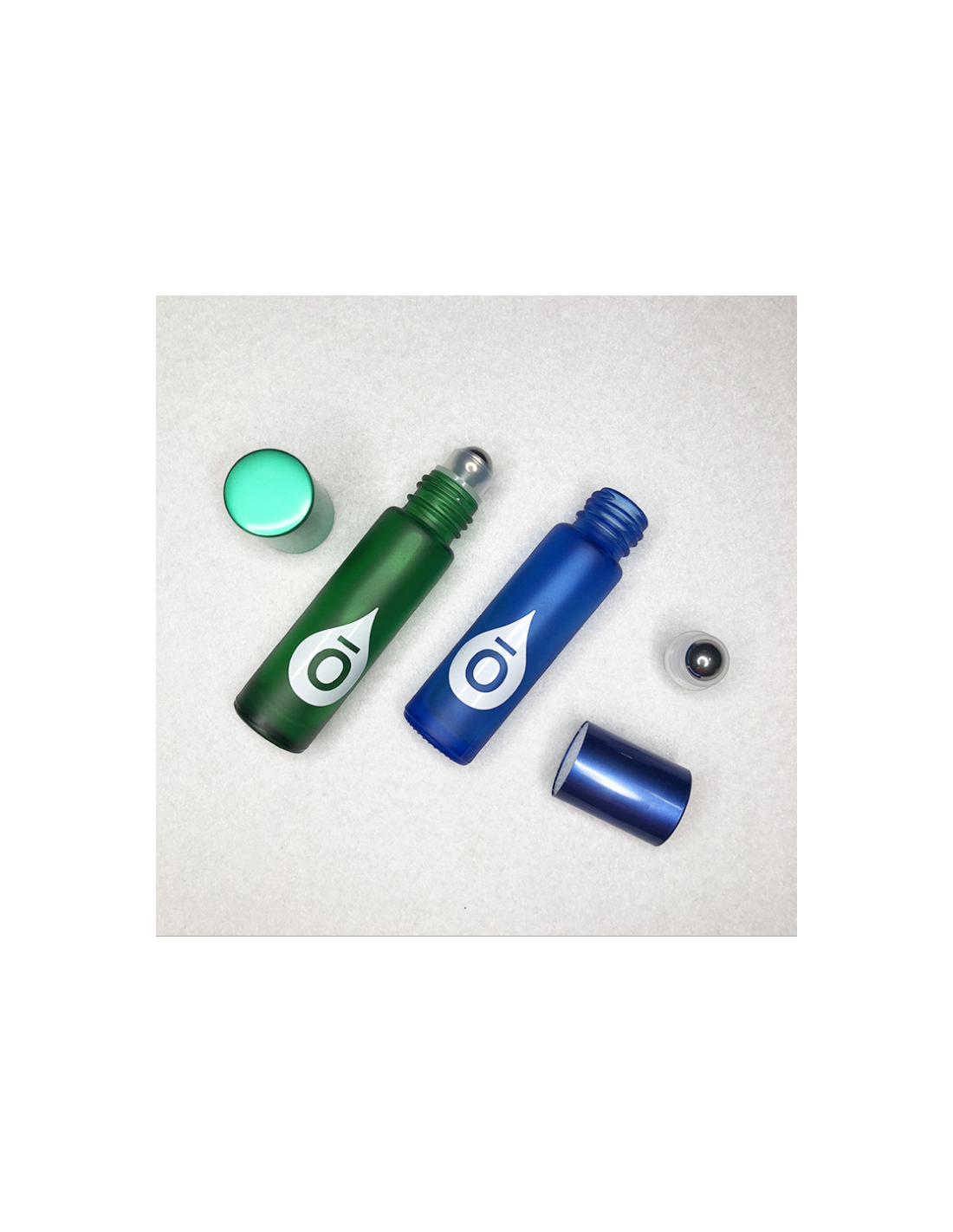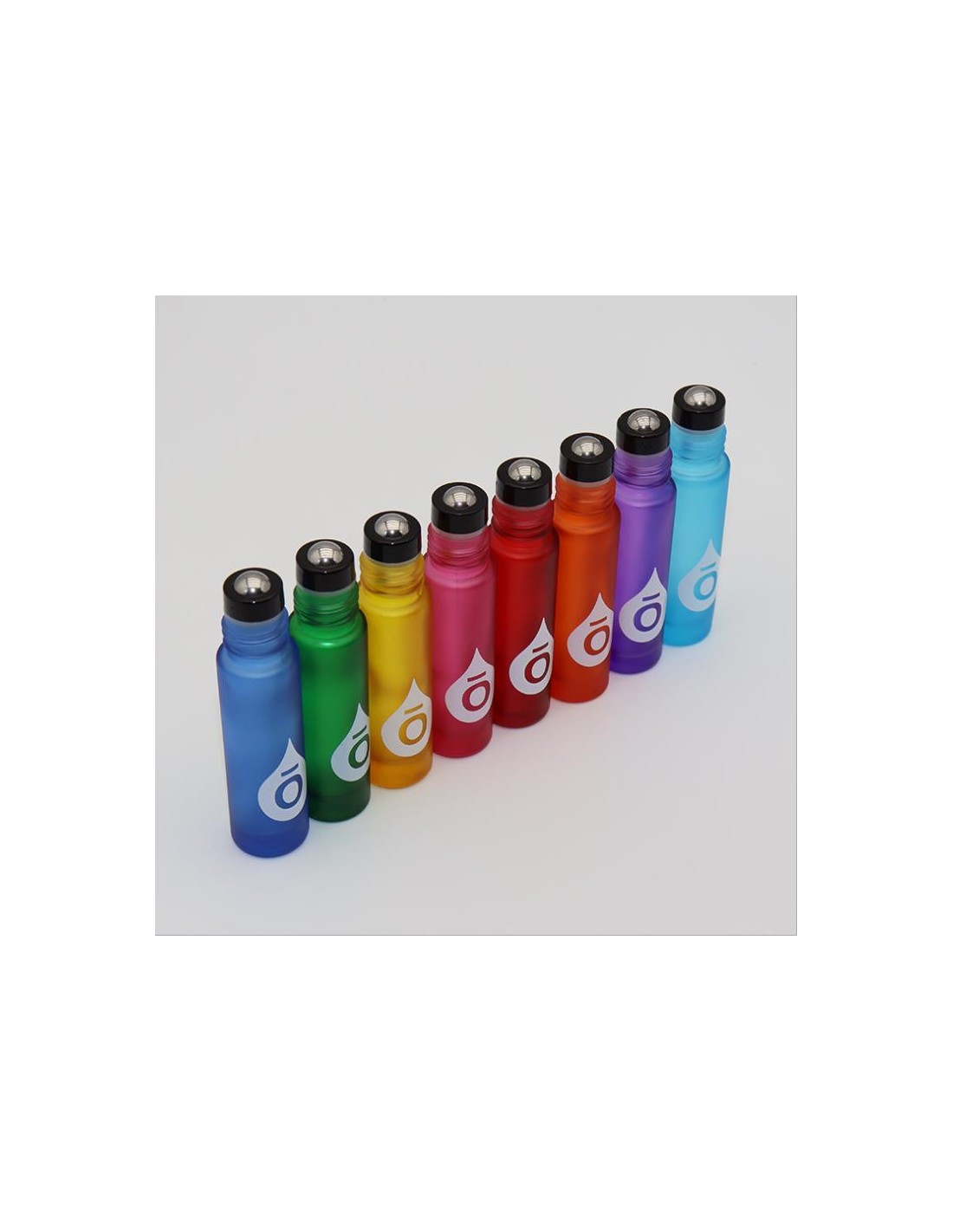 Smoked glass bottle in various colors, with metal cap and roller ball. Sold by lot with color mix: red, purple, blue, pink and orange.