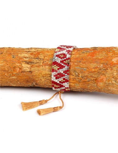 This wide pearl bracelet with geometric patterns is reminiscent of Brazilian bracelets but better! The fastener, a macramé knot, ends with soft, fancy tassels in the main color of the bracelet. The beads are shiny, sometimes gold or silver depending on the model.
