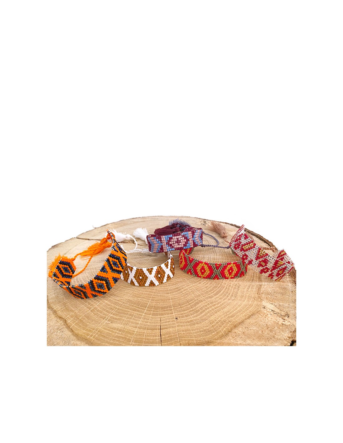 Wide bracelet with beads braided to form geometric patterns, with tassels in the colors of the beads. A delicate and elegant accessory perfect for adding a touch of chic to your outfit!