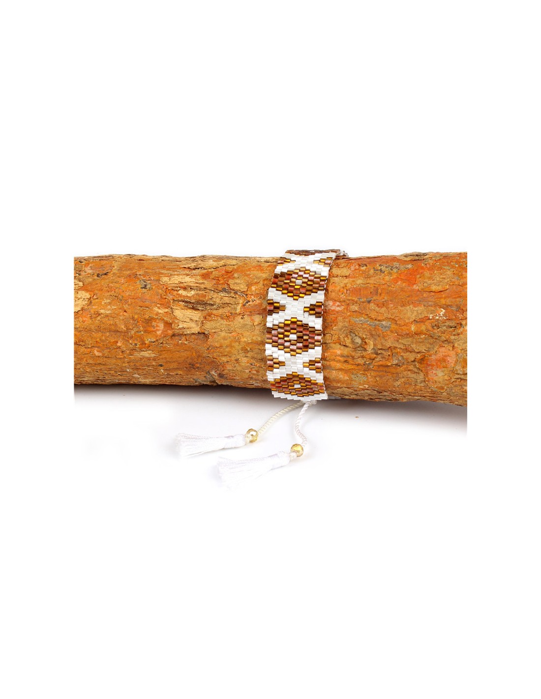 This wide pearl bracelet with geometric patterns is reminiscent of Brazilian bracelets but better! The fastener, a macramé knot, ends with soft, fancy tassels in the main color of the bracelet. The beads are shiny, sometimes gold or silver depending on the model.