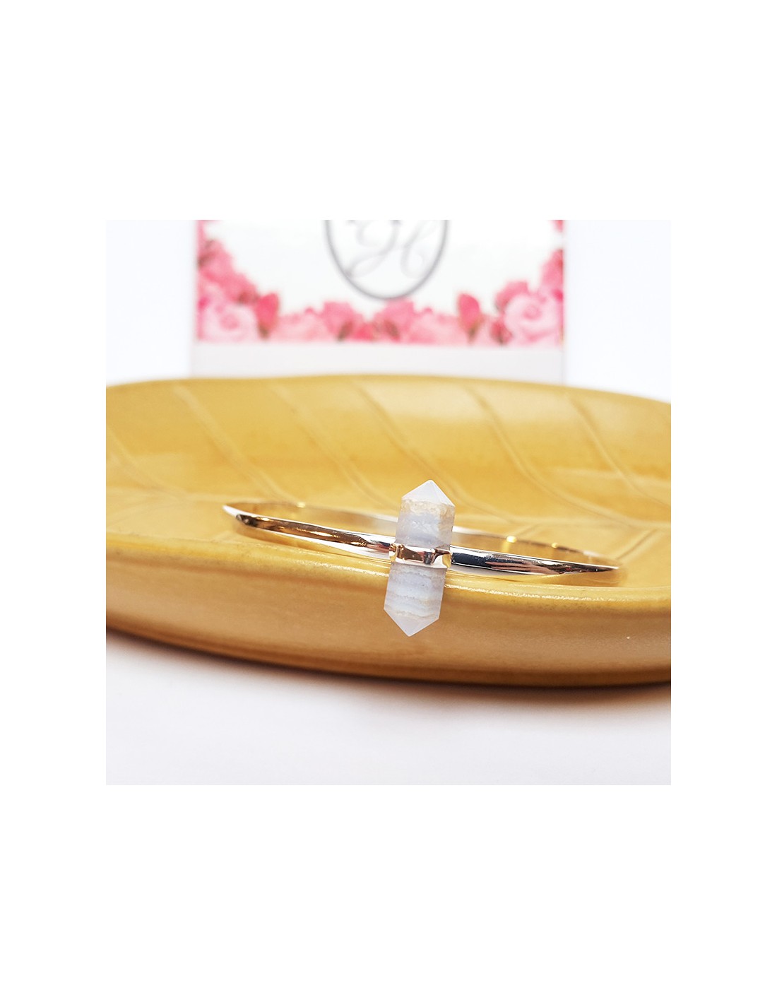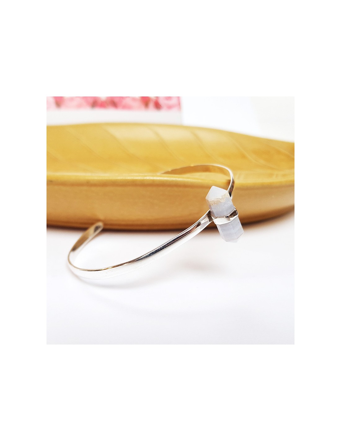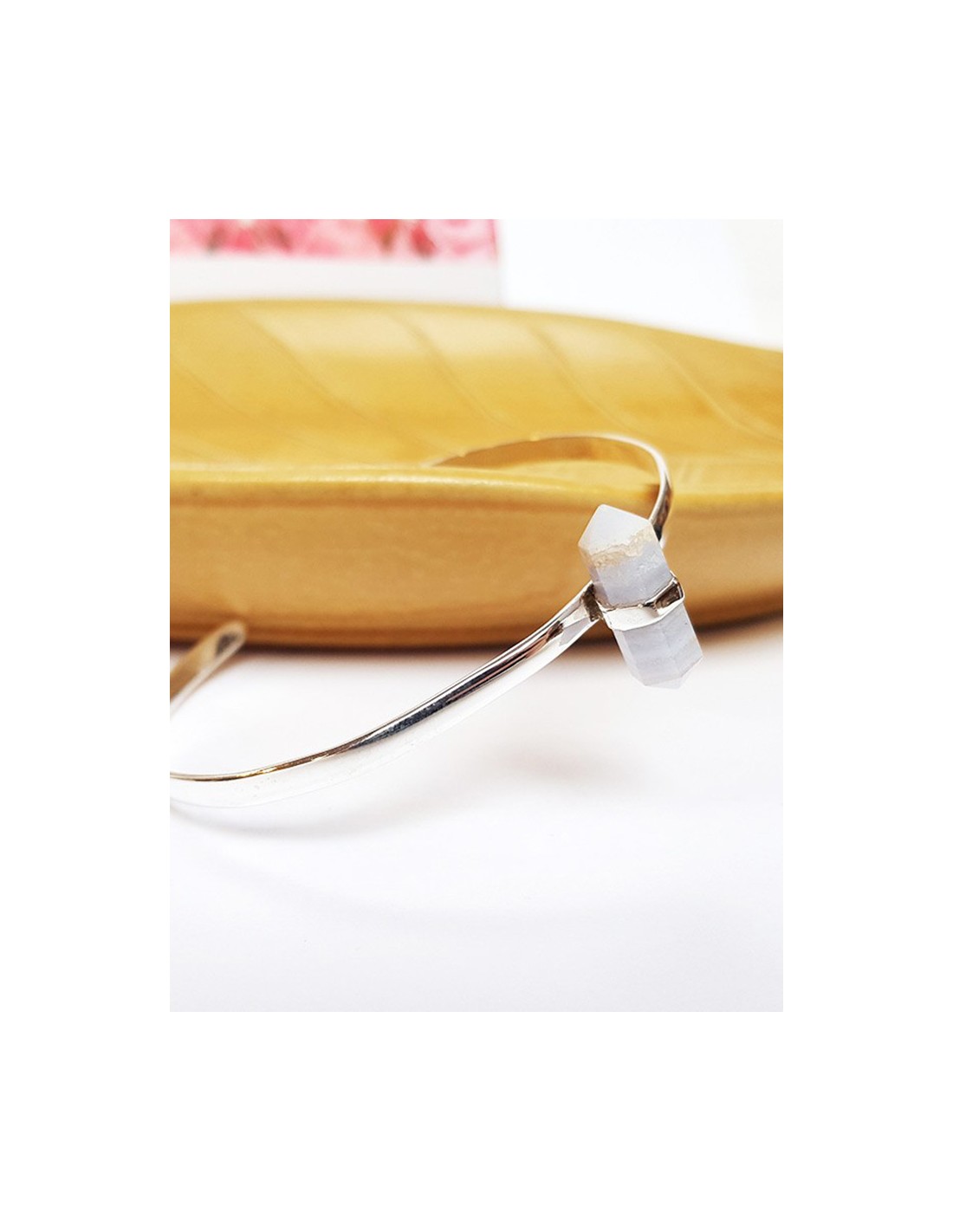 This bracelet is made of real 925 silver and is adorned with a beautiful fine chalcedony stone, also called Blue Lace agate, cut into a double point. A discreet and chic accessory, its sleek design highlights the fine stone.