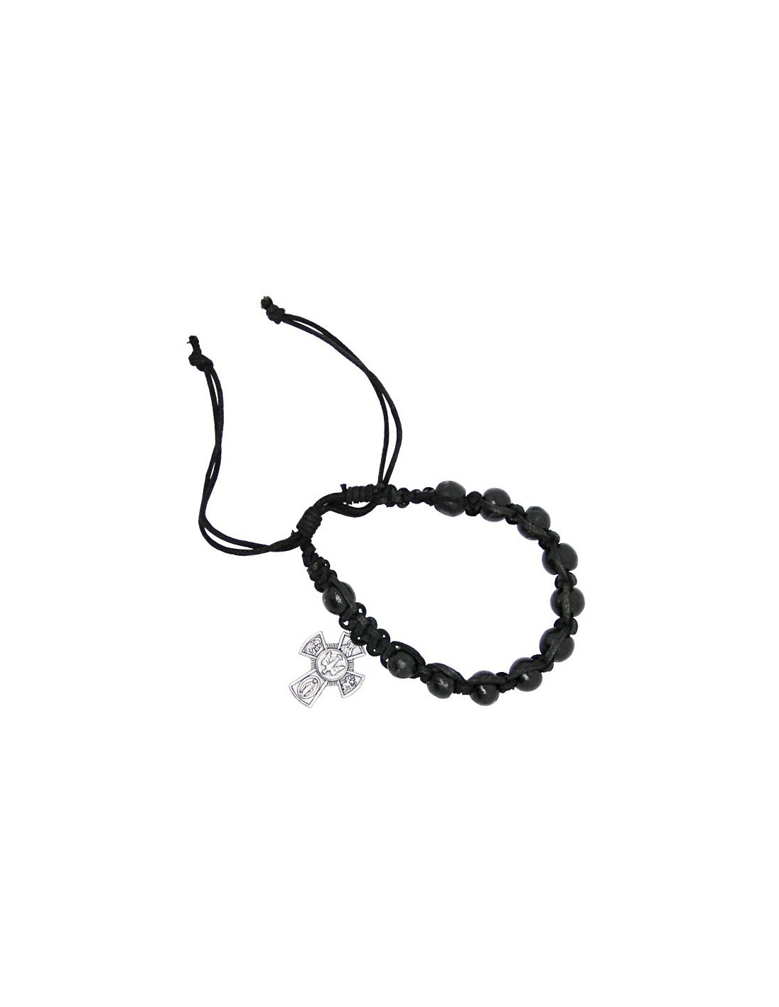 The new bracelet made of leather threads and braided black wooden beads is an elegant piece of jewelry with a natural and bohemian touch. It is adorned with a silver plated cross on which are chiseled the figures of the Holy Protectors. The number of pearls also allows to use this jewel as a ten for prayers.