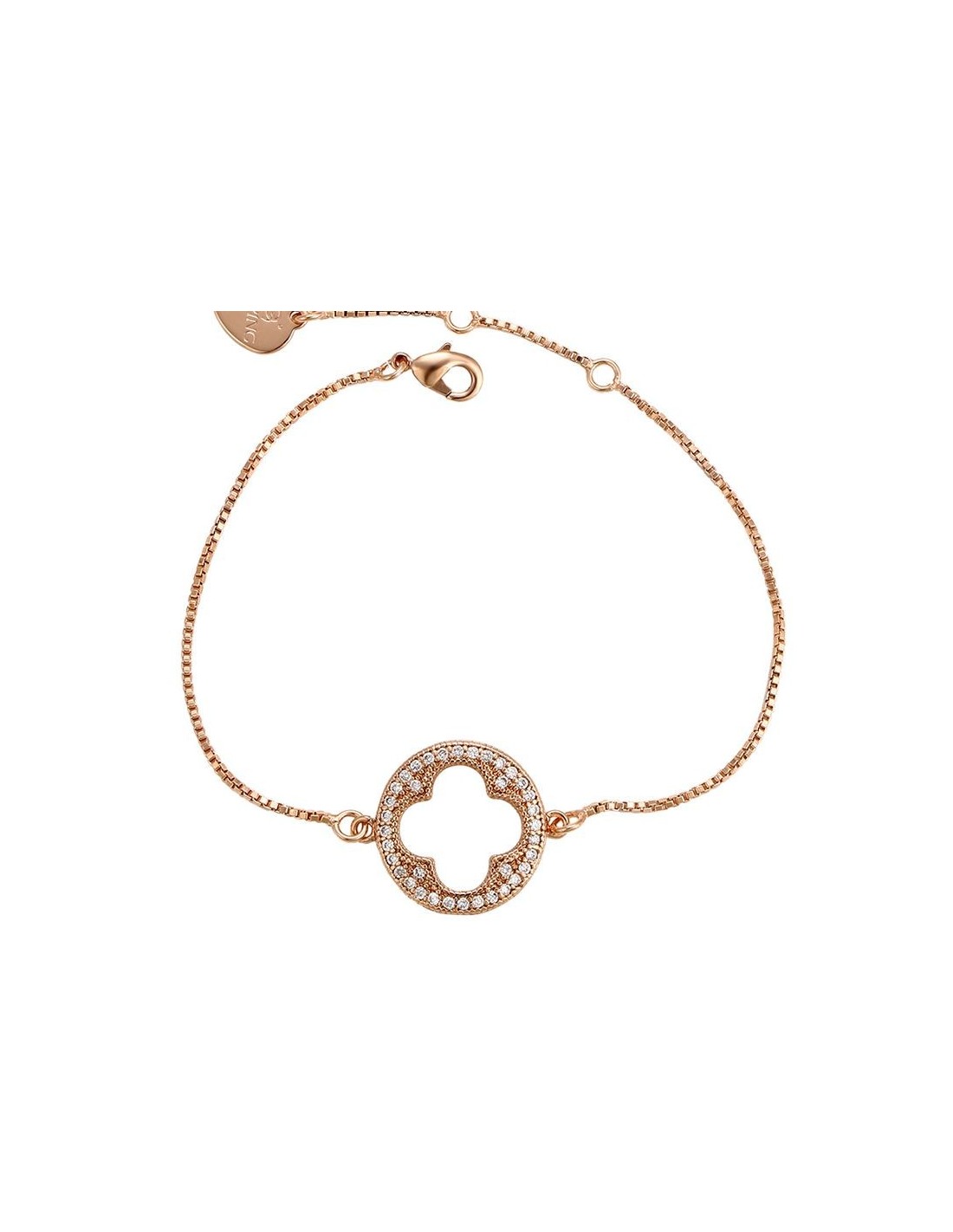 Bracelet en plaqué or rose. Ce bijou est constitué d'une chaînette à maillons carrés et d'une perle centrale en forme de fleur à quatre pétales sertie de cristaux.