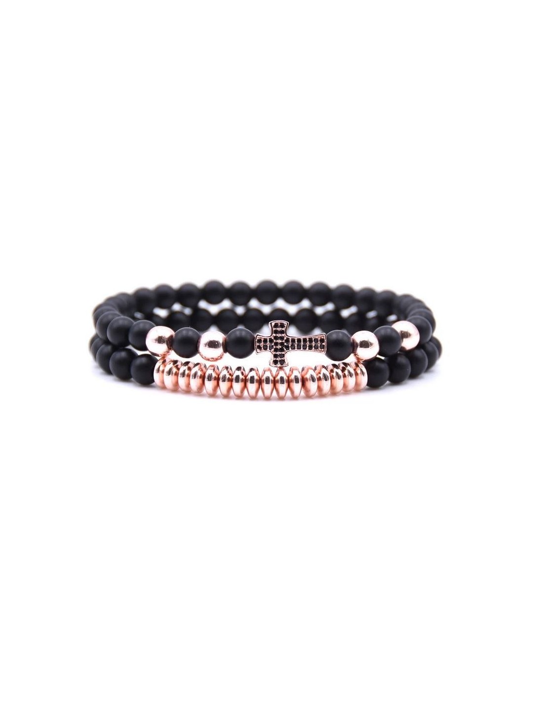 A bracelet is good. A matching pair is even better! These are made of matte black beads and shiny copper beads. These touches with gold and pink highlights give this set all the chic. The cross charm adds the finishing touch, also copper and set with black crystals.