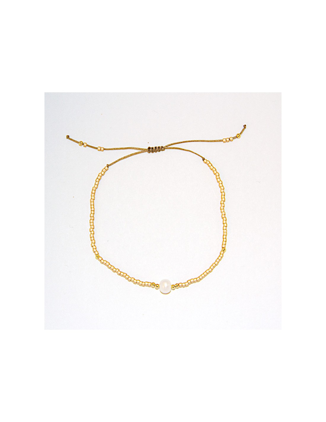 This delicate and fine bracelet is adorned in its center with a real mother-of-pearl pearl, itself encircled by golden pearls that highlight it. Other golden pearls elegantly dot the thread of the bracelet and its ends like luminous touches to brighten the whole. The macramé knot echoes the mother-of-pearl bead and the flying threads with four pearls add a light and subtle touch.