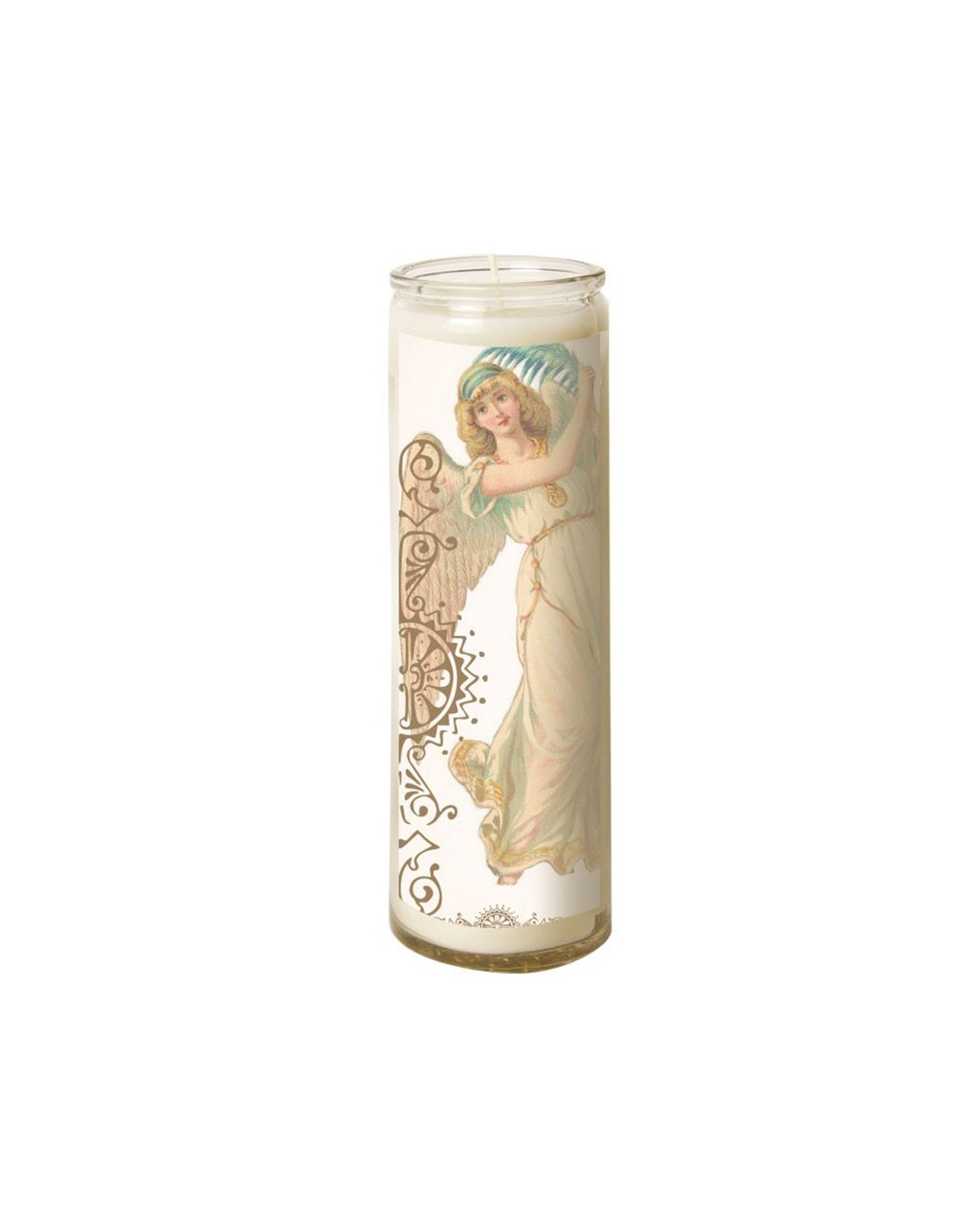 Candle in a transparent glass container, which can burn for 7 consecutive days. Of good quality, it does not give off any odor. With the image of a beautiful angel holding a branch as decoration, this candle can be used for prayer, meditation, decoration or esotericism.