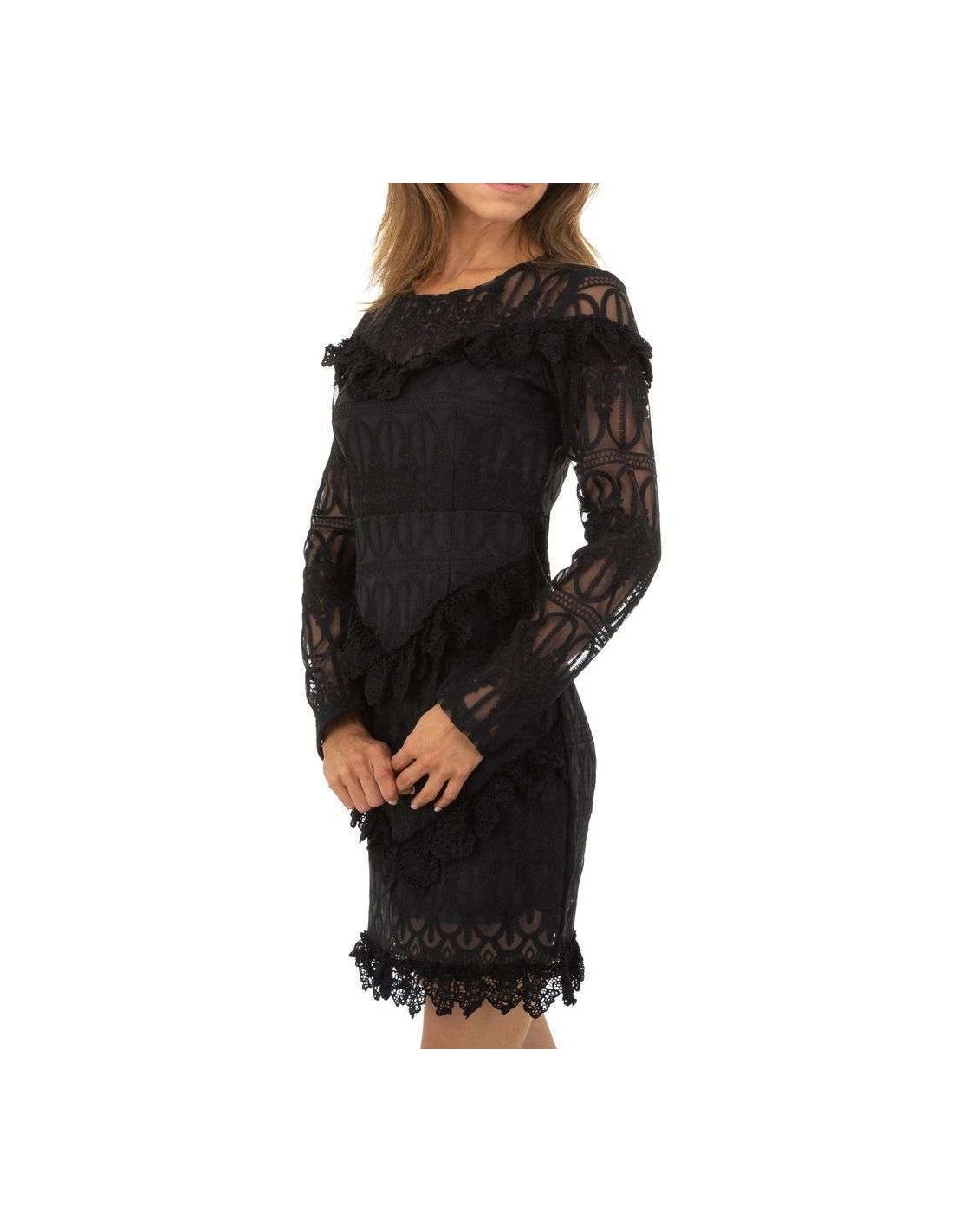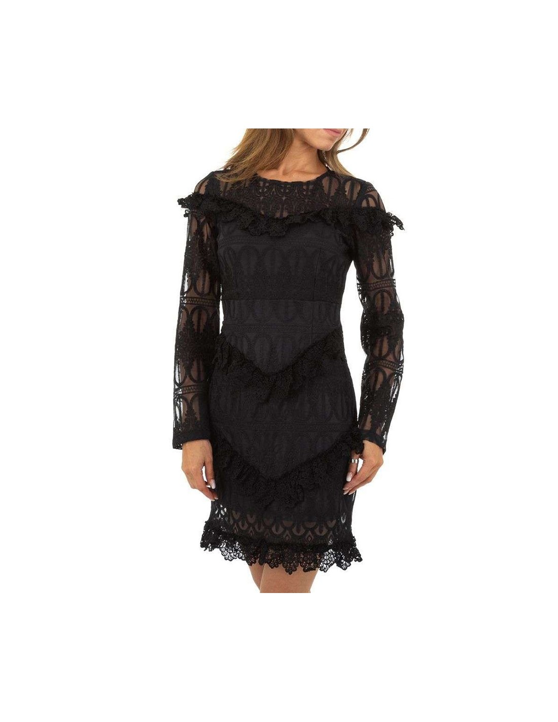 Very chic black short dress, decorated with lace. The shoulders and sleeves are made of a fine translucent mesh in addition to lace.