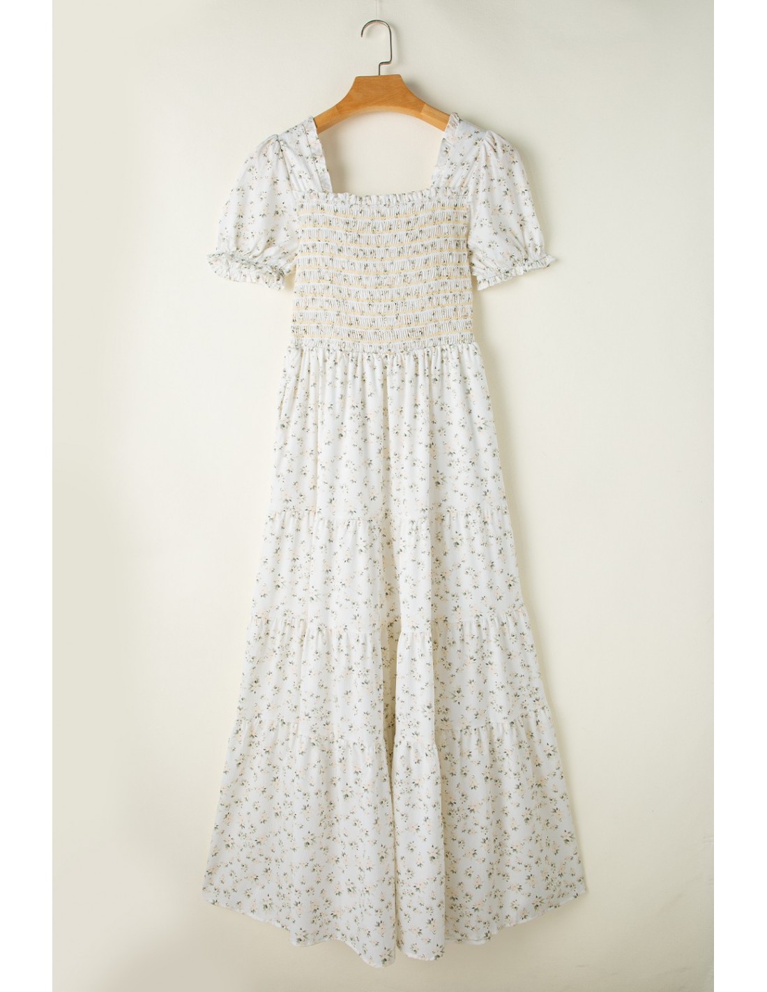 White Floral Maxi Dress with Shirred Bodice and Ruffles