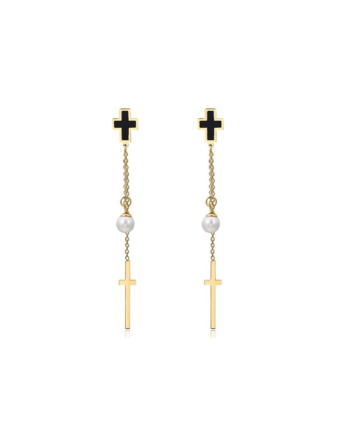 Hanging earrings with white pearls and two golden crosses, one of which is varnished with black. Stainless steel jewel plated with 14 carat gold.
