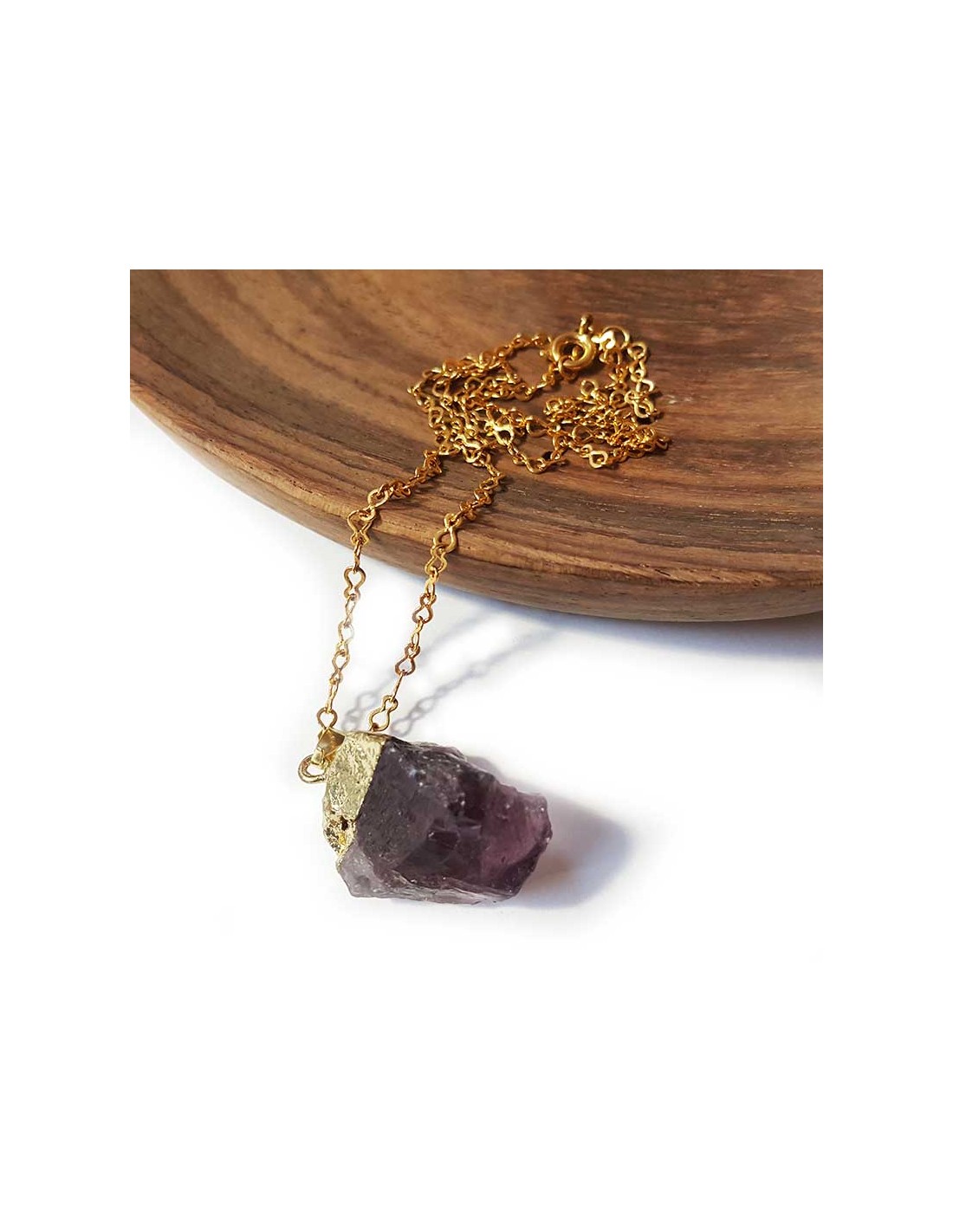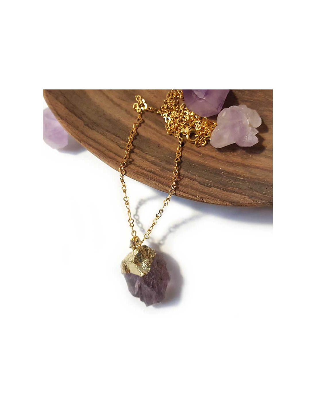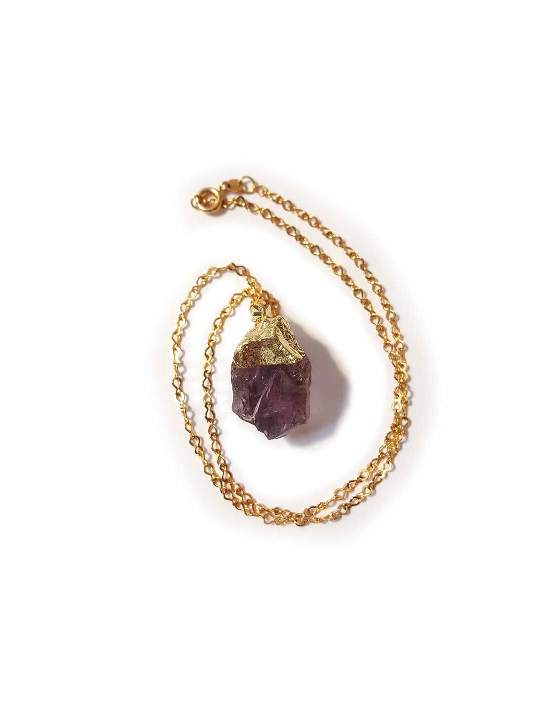 This amethyst pendant is extravagant and bohemian. Gold plated at the top, the stone is left rough, revealing all its natural subtleties. The gold-plated chain is included.