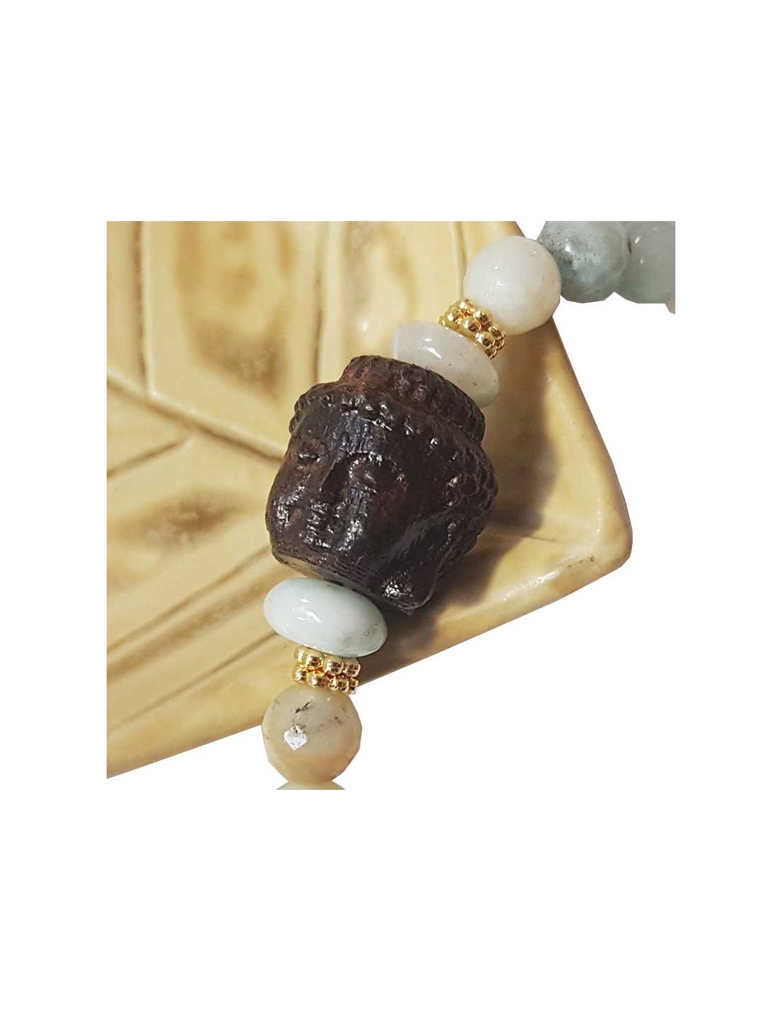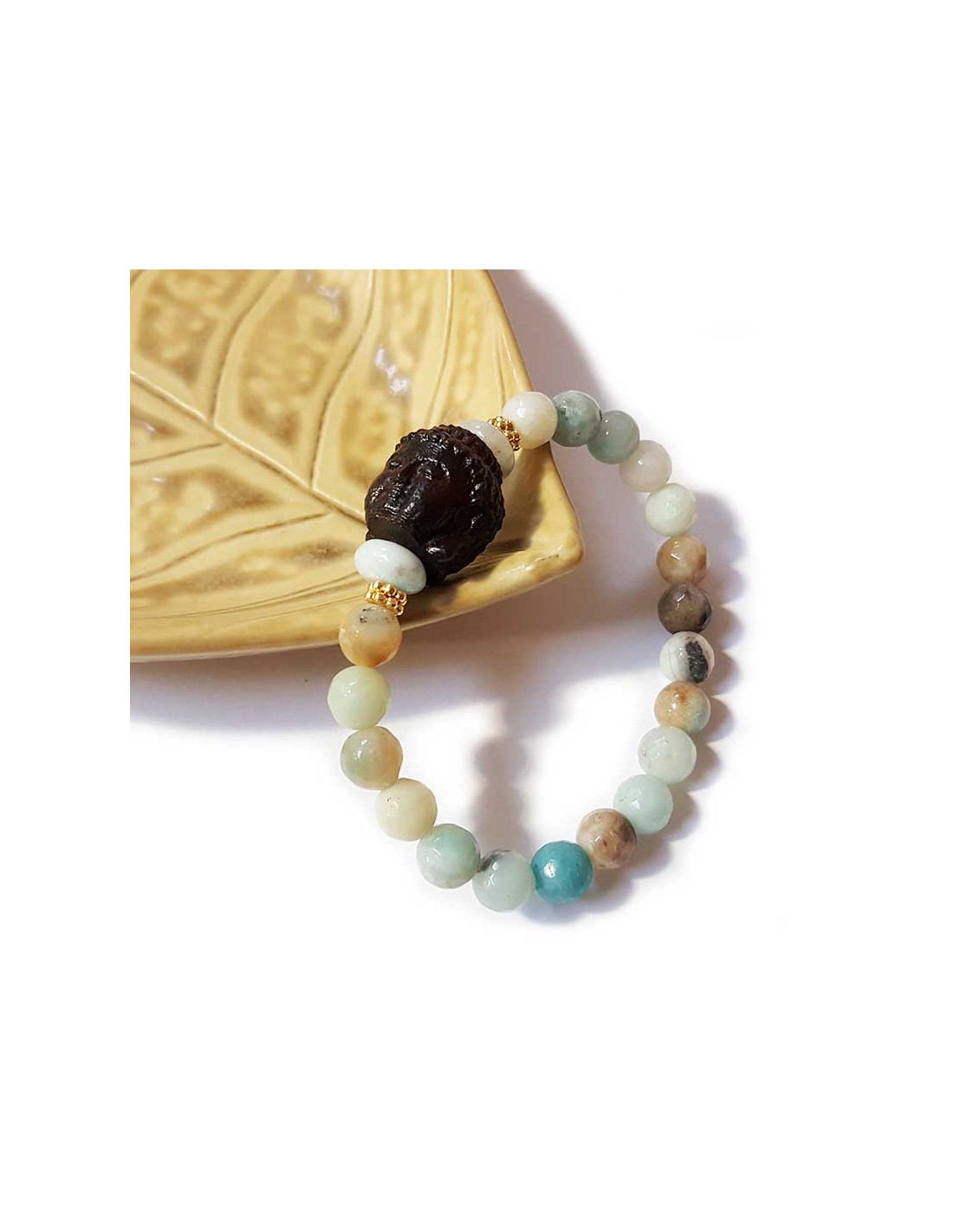Round amazonite beads and river stones bracelet, with Buddha head carved in wood. A trendy jewel with soft colors.