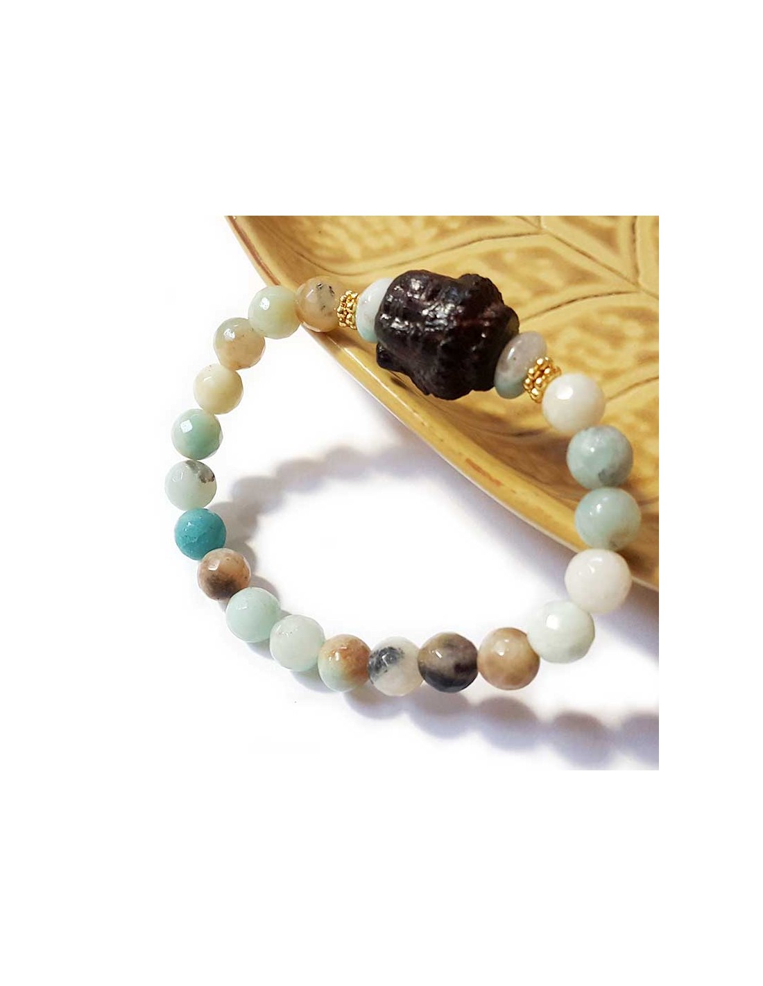 This bracelet of round, slightly faceted stone beads is composed of a carved Buddha head. The beads are a mixture of amazonite and river stones. A simple piece of jewelry that brings its touch of soft colors and a little bubble of calm!