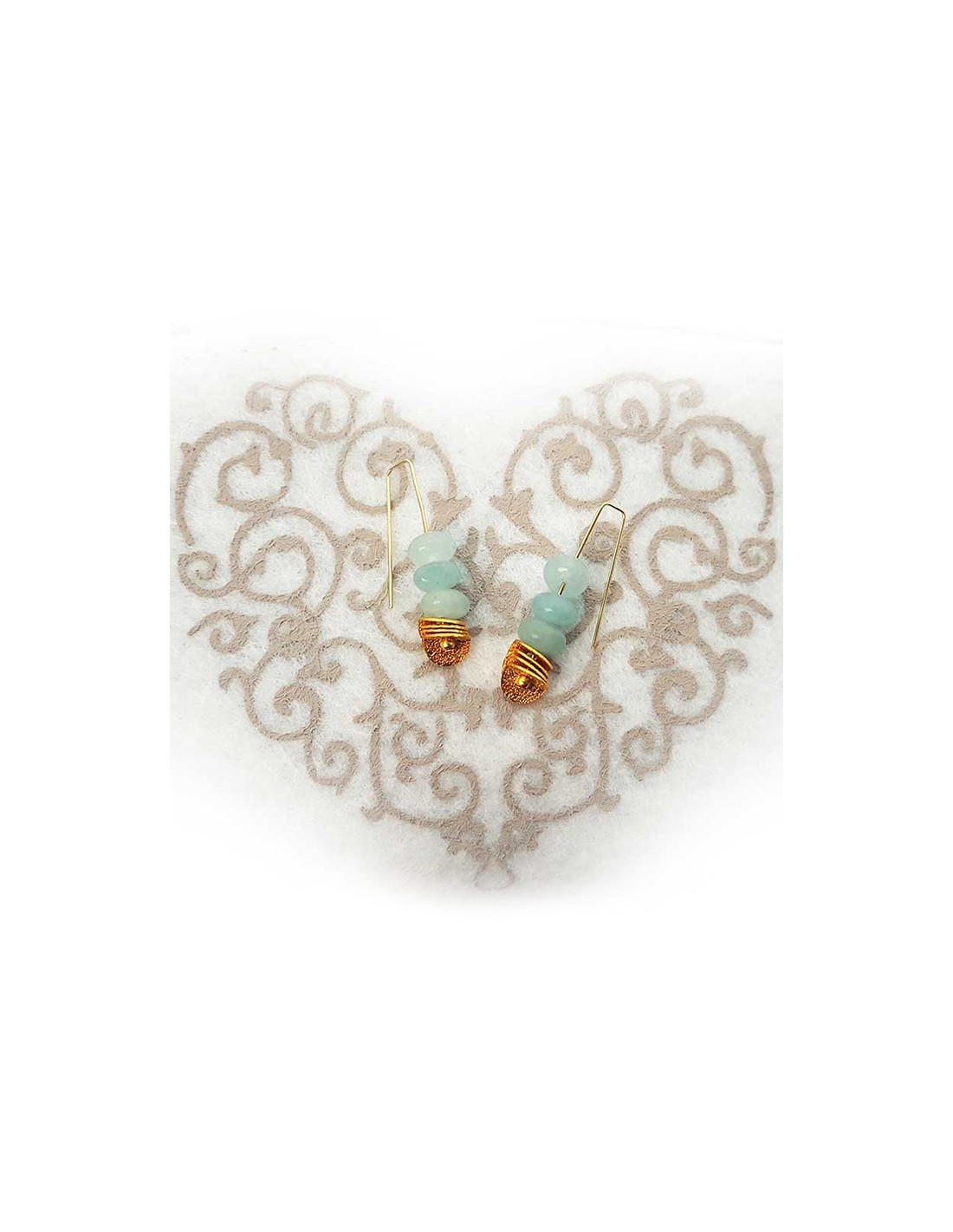 These dangling earrings are fine and elegant while bringing a natural and exotic touch. Adorned with three faceted blue jade beads and golden chips, they go with everything.