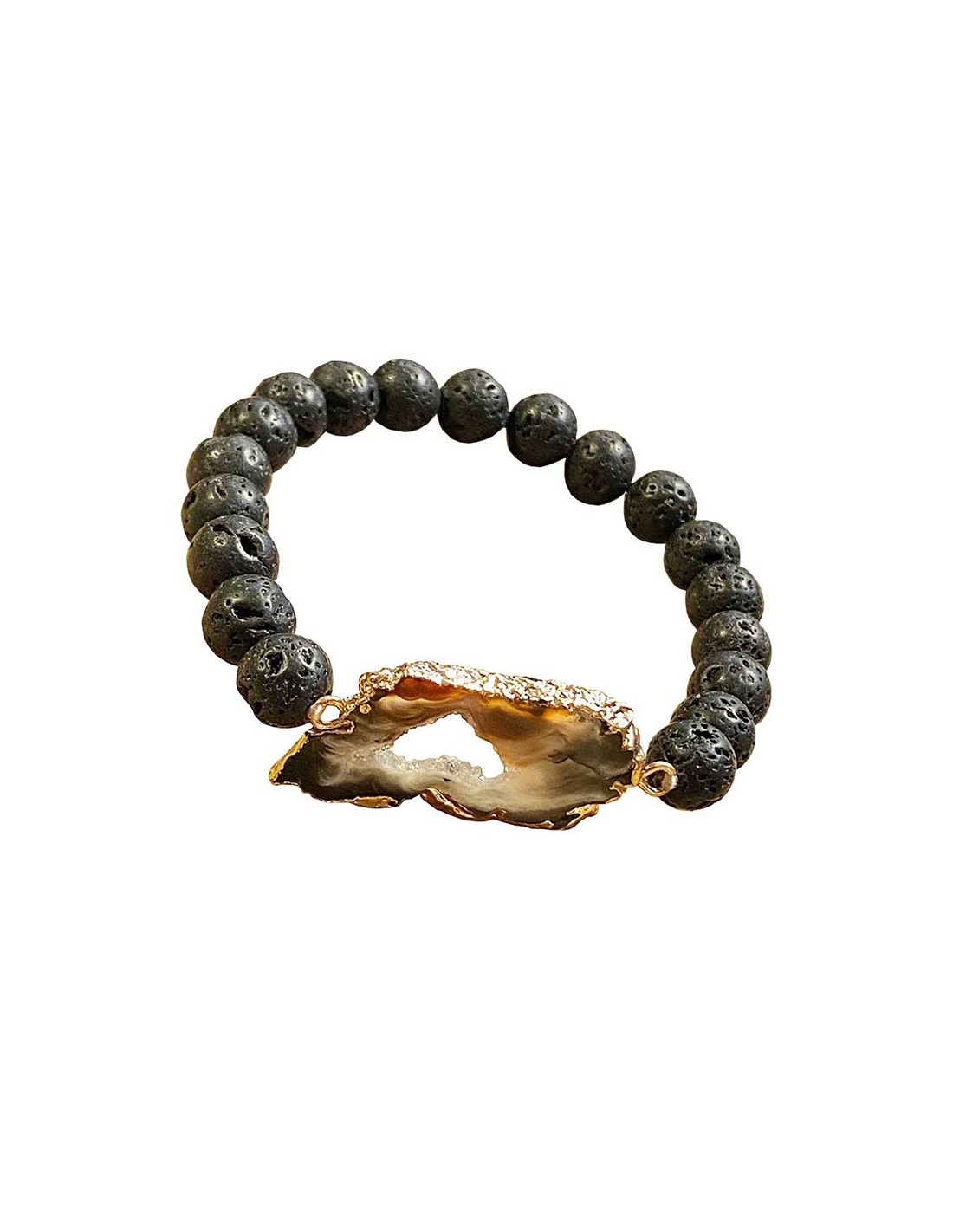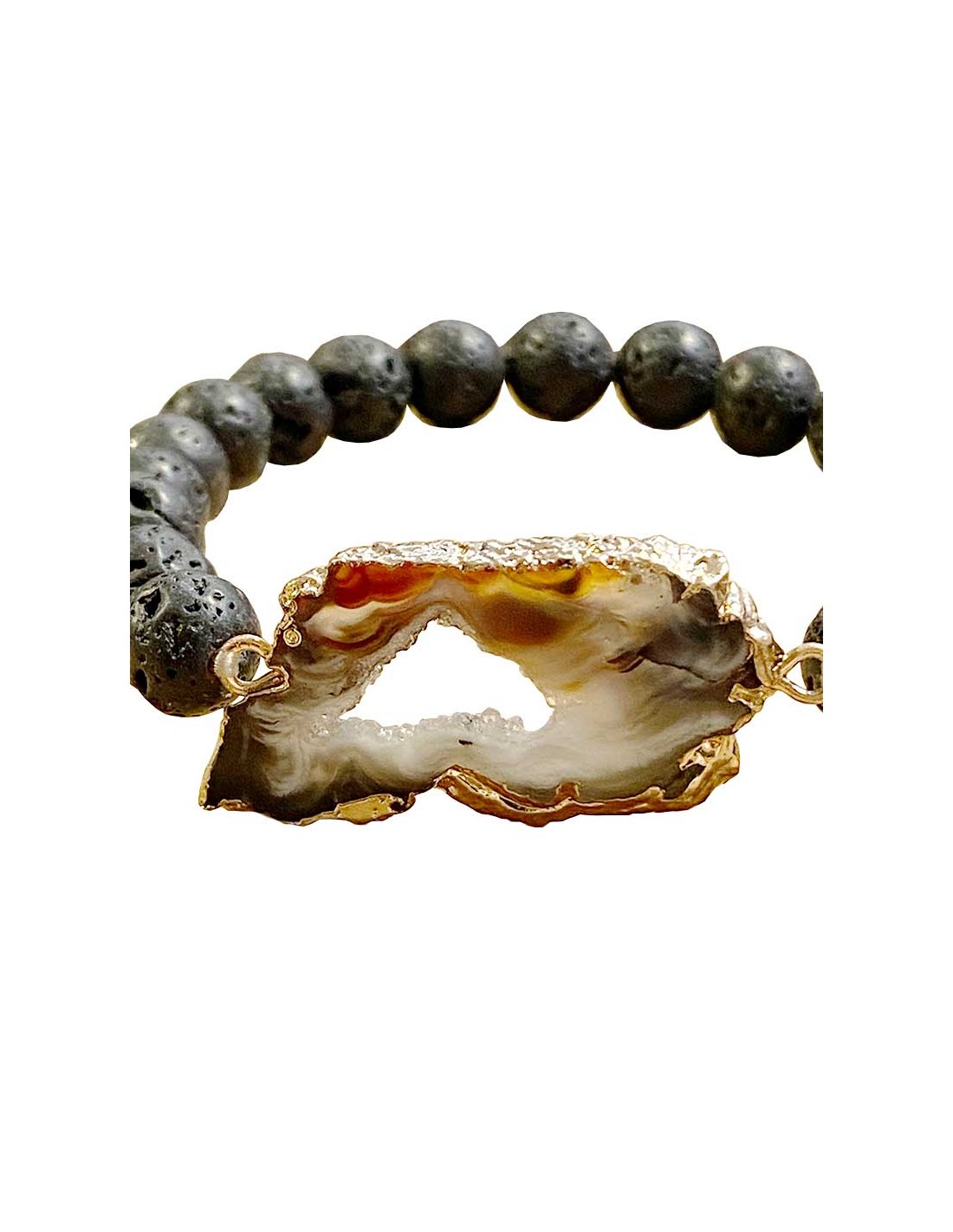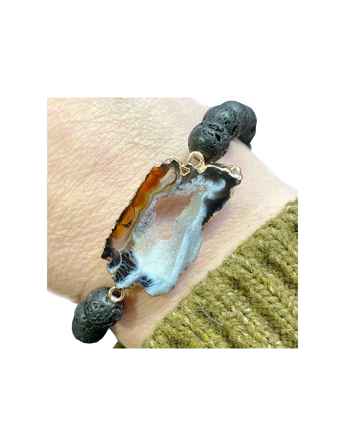 Elastic bracelet made of lava stone and natural agate slice. The pumice stones are cut into soft round beads. The agate is painted with gold on its edges, highlighting its crystals.