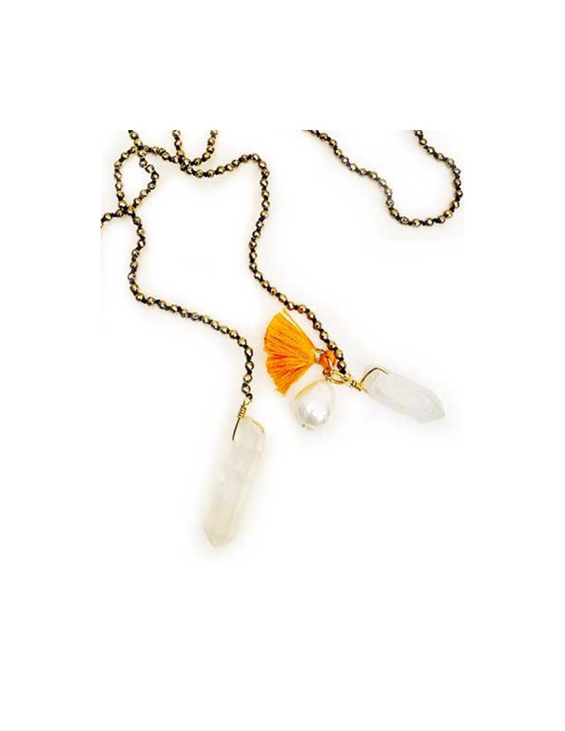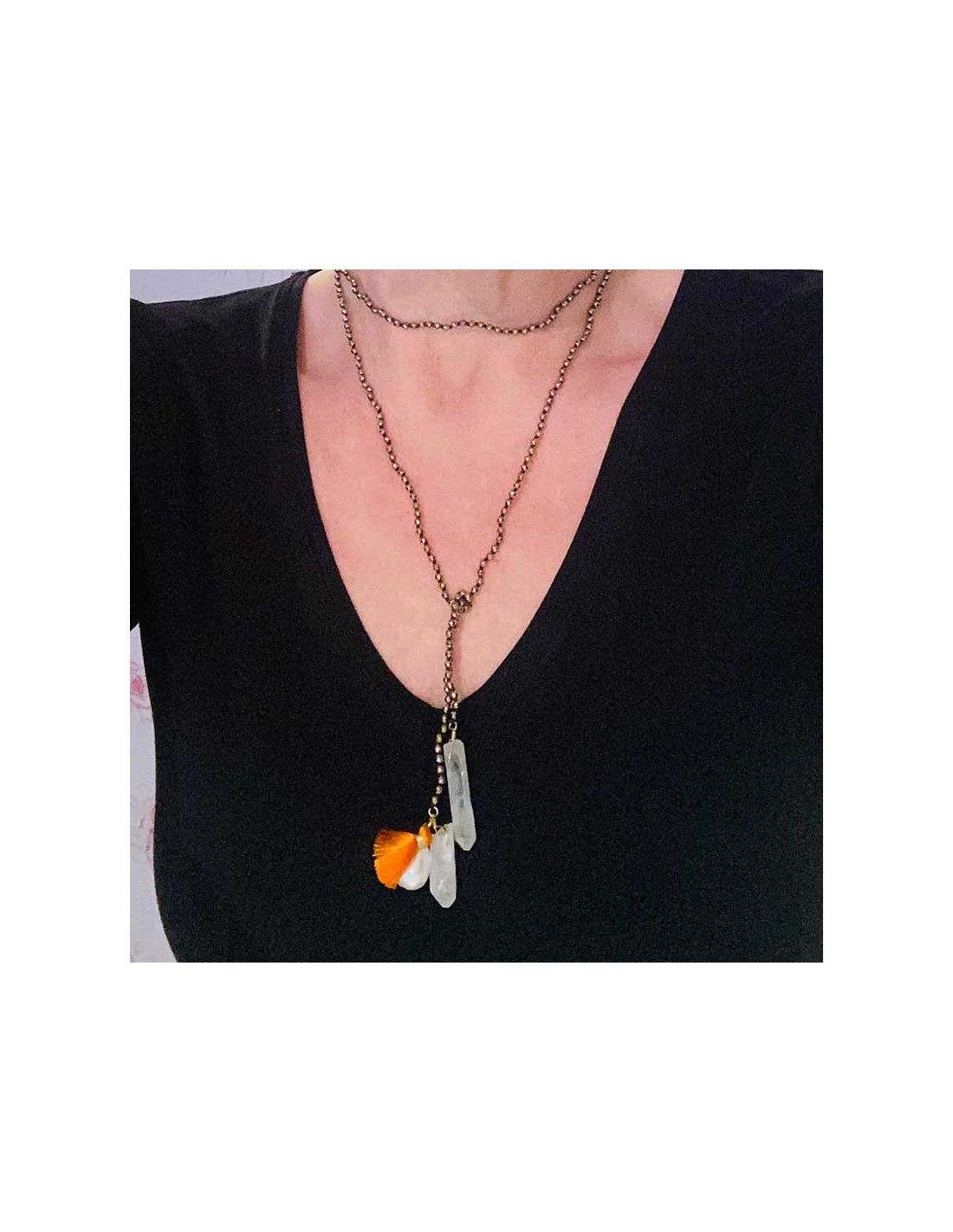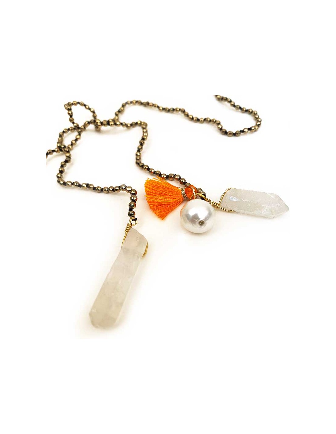 This necklace will surprise many! You can tie it yourself and wear it at the length of your choice. Both ends are made of natural rock crystal spikes, a mother-of-pearl drop bead and a bright orange pompom. The chain is made of faceted golden hematite beads.