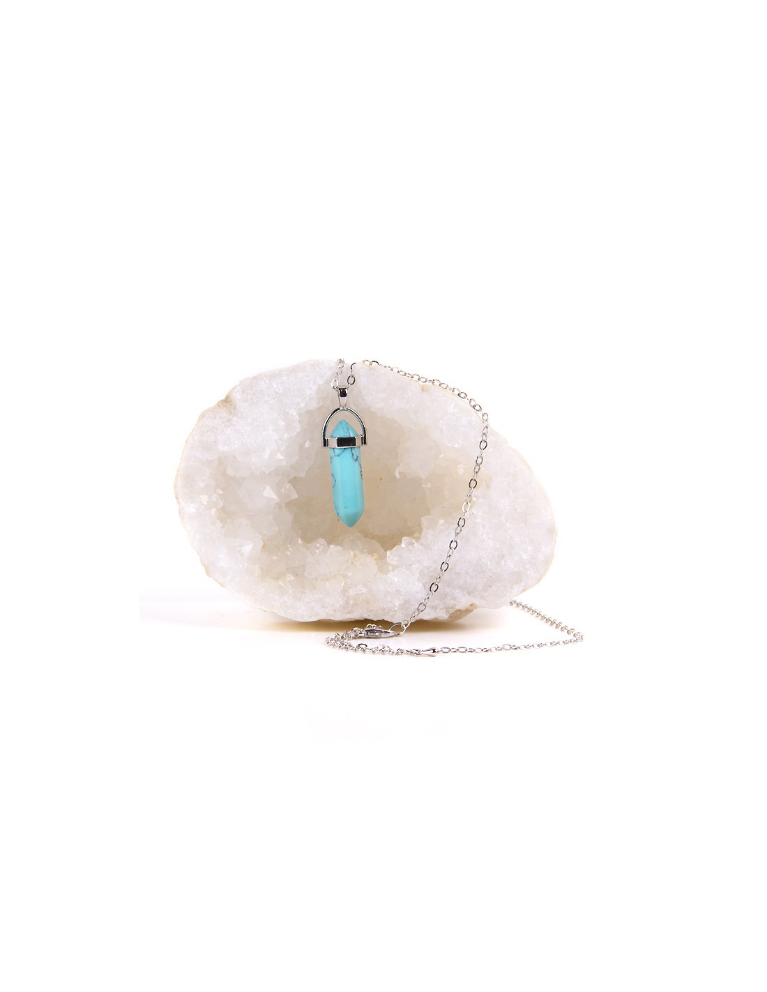 Silver plated necklace with artificial turquoise stone. Turquoise is blue-green with dark streaks and symbolizes communication. In energetics, it is recognized as useful for expression, social relationships, the immune system but also protection.