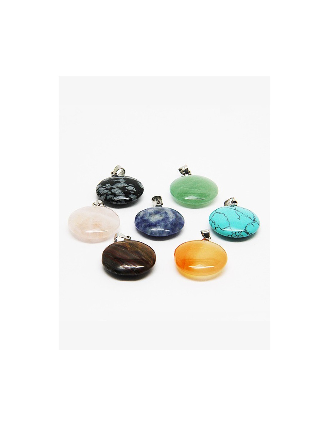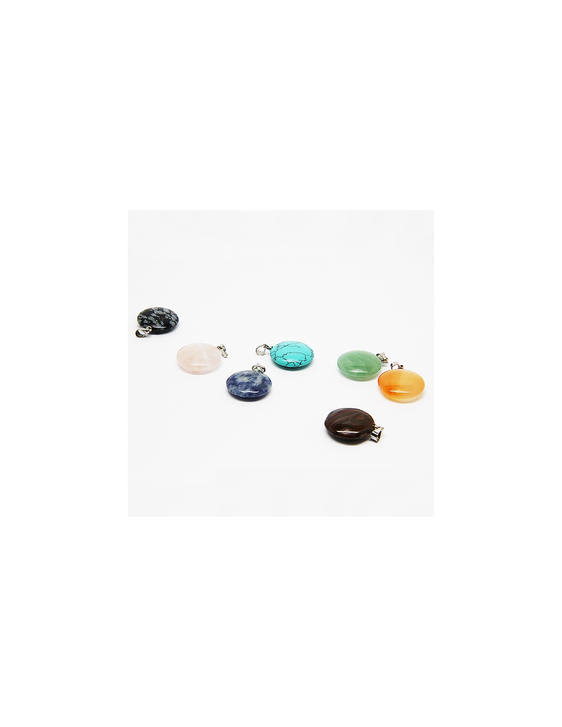 This necklace comes with 7 round pendants. The seven stones are snowflake obsidian, carnelian, tiger eye, rose quartz, green aventurine, reconstituted turquoise and sodalite.