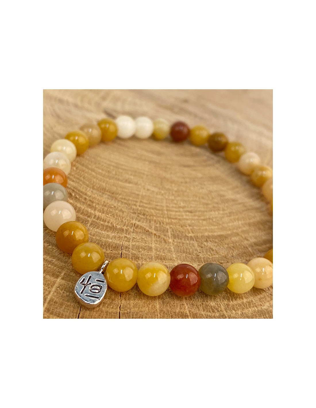 Elastic thread bracelet with natural yellow jade stones. Accompanied by a small silver charm, this bracelet gives a soft and serene touch to your wrist.