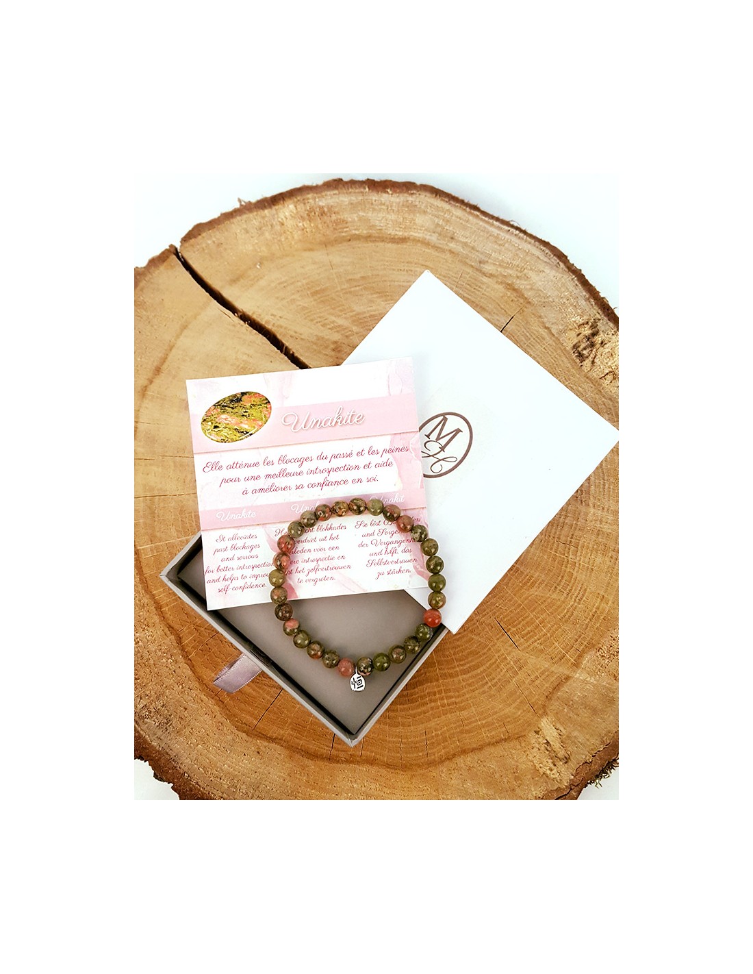 Elastic thread bracelet in unakite, fine natural stone. Accompanied by a small silver charm, this bracelet gives a soft and serene touch to your wrist.