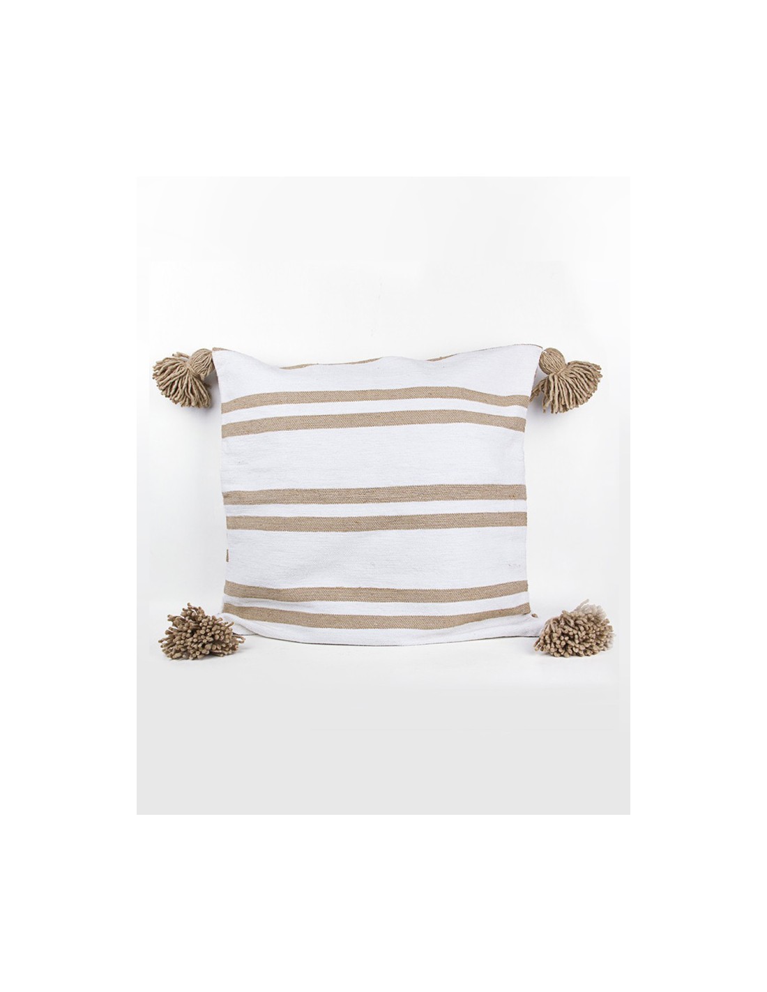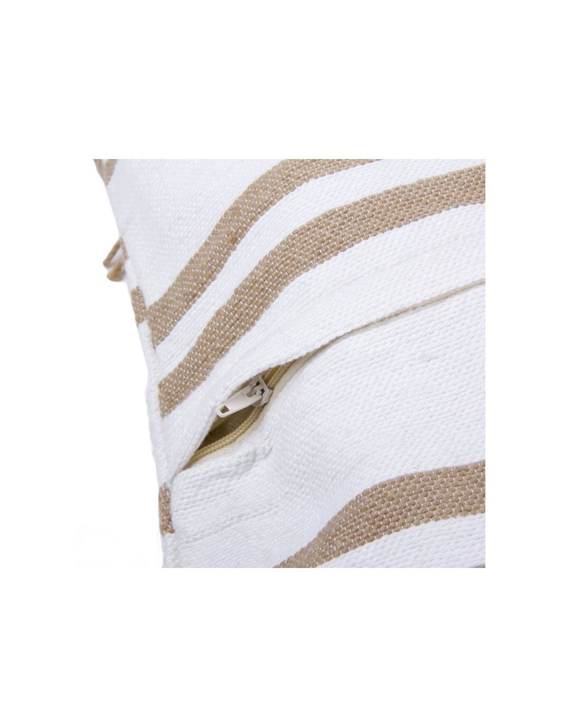 Cotton cushion cover, hand woven by local artisans. It has a white background with three pairs of beige lines, a simple and natural aesthetic that goes with any type of interior.