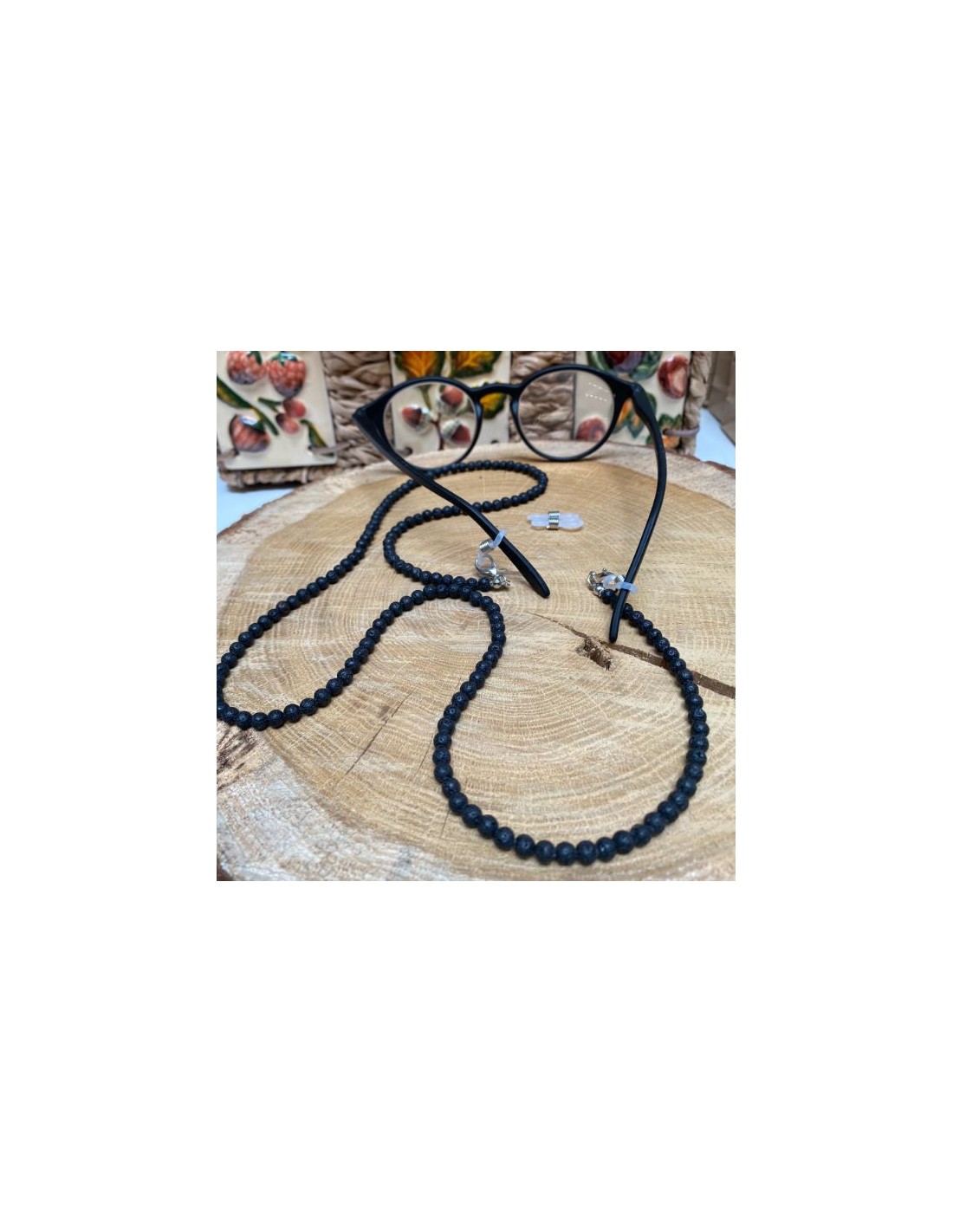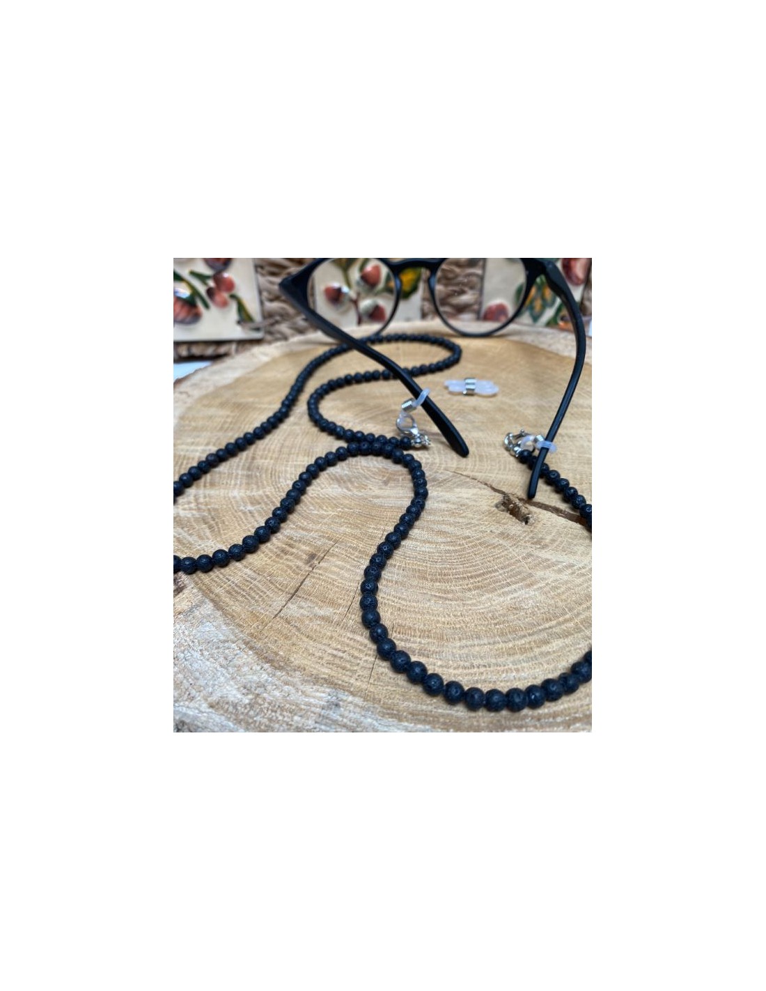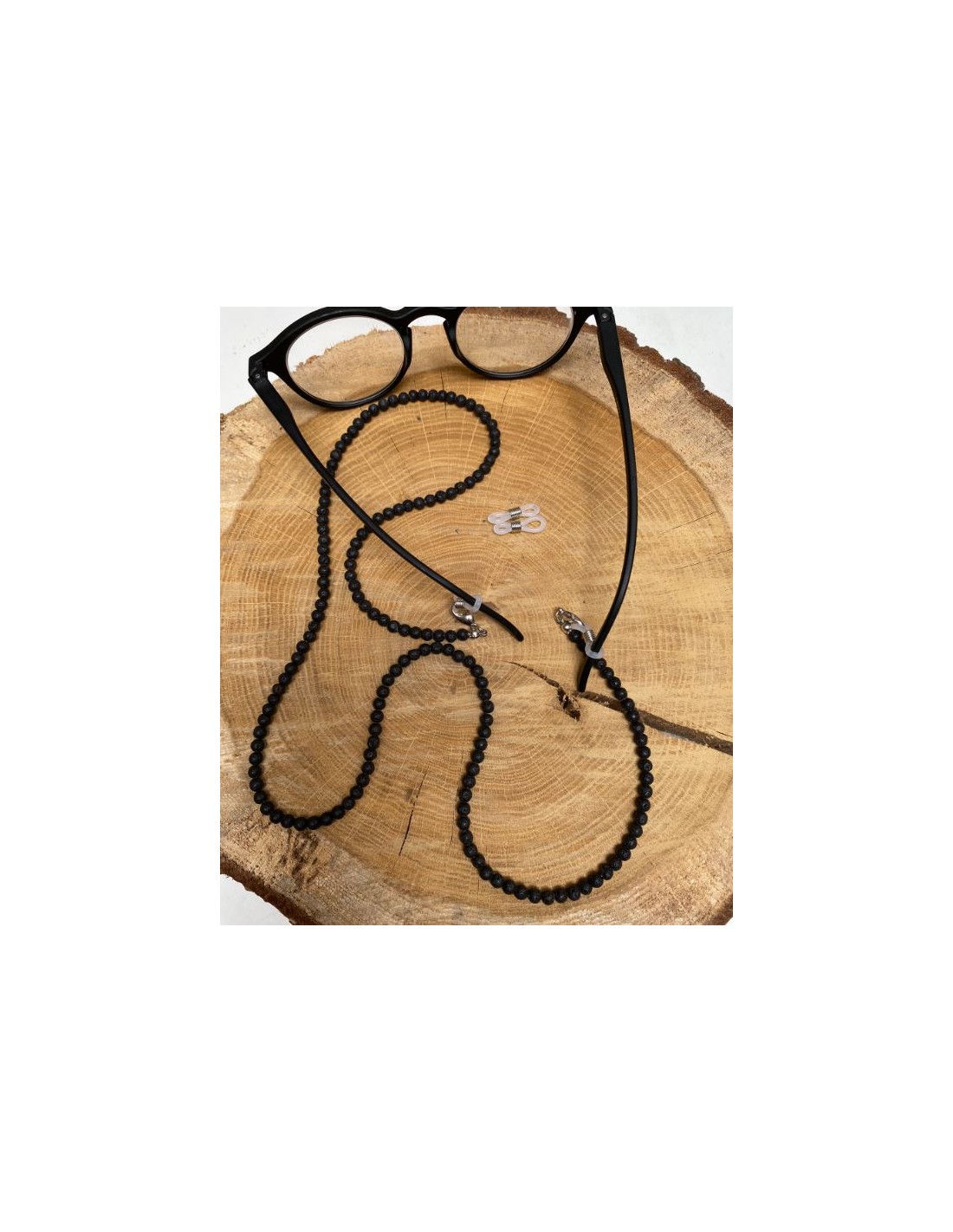This glasses cord is a chic and practical accessory. Practical to keep your glasses on you without having to wear them, chic thanks to the lava stone beads, a fine stone known in lithotherapy for its virtues.