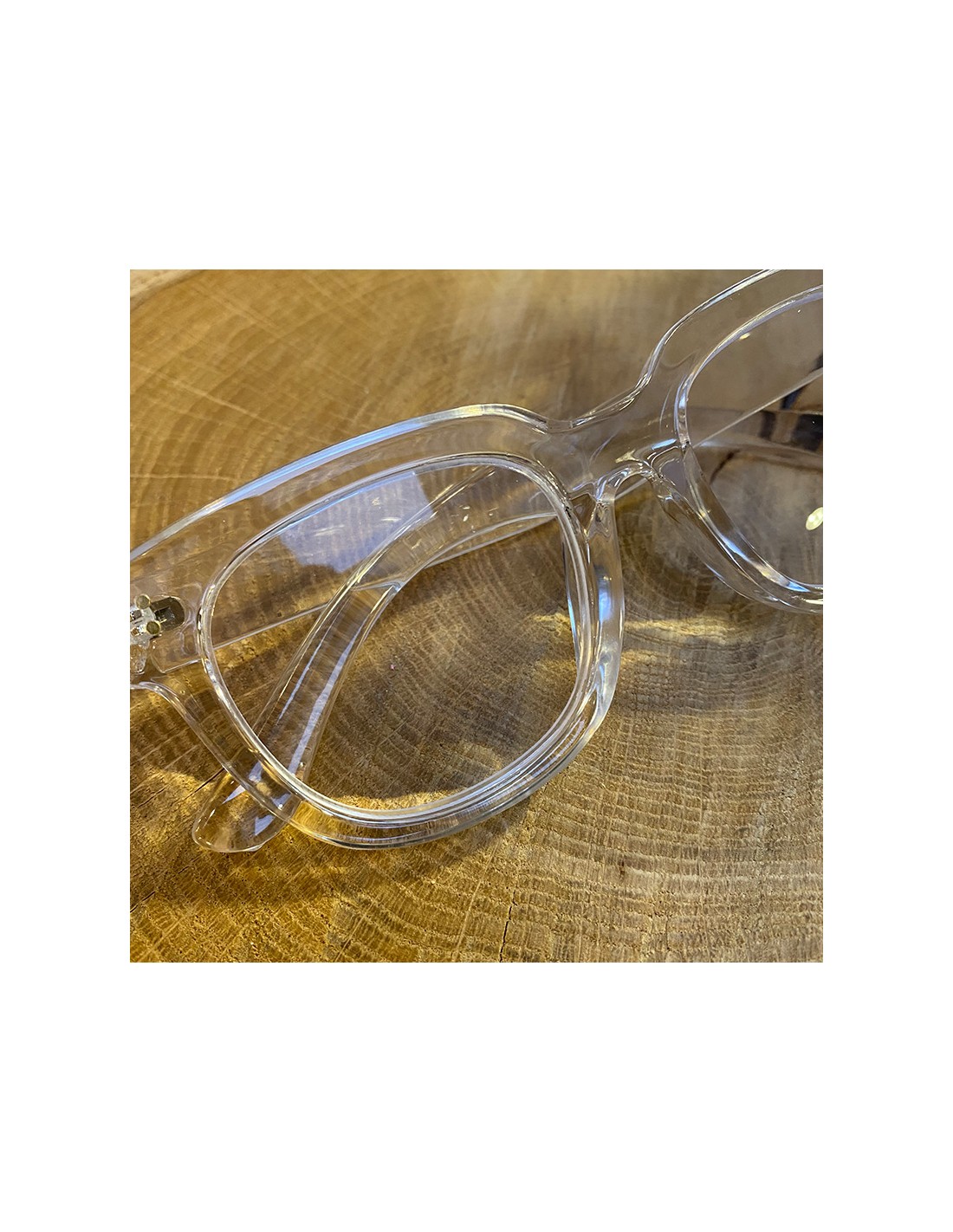 Clear reading glasses with 3.00 correction and blue light filter. The thick style of the frame is reminiscent of the 60's fashion, for a vintage touch. The transparent aspect of the frames brings a modern and original touch.