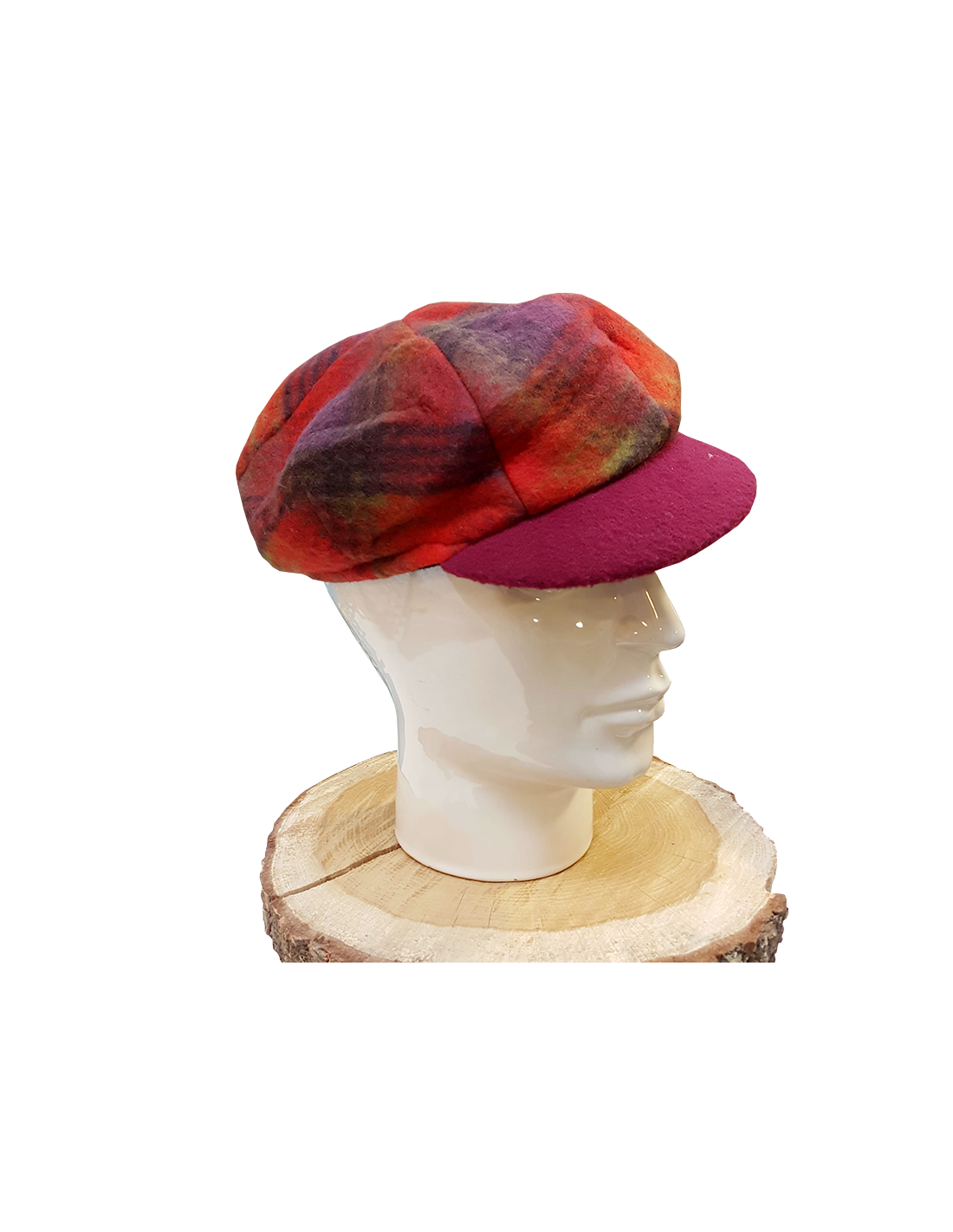 Women's red polyester gavroche beret with a checkered pattern reminiscent of tartans. Brightened up with bright colors, this headwear is perfect to give a little vivacity on gray or cold days.