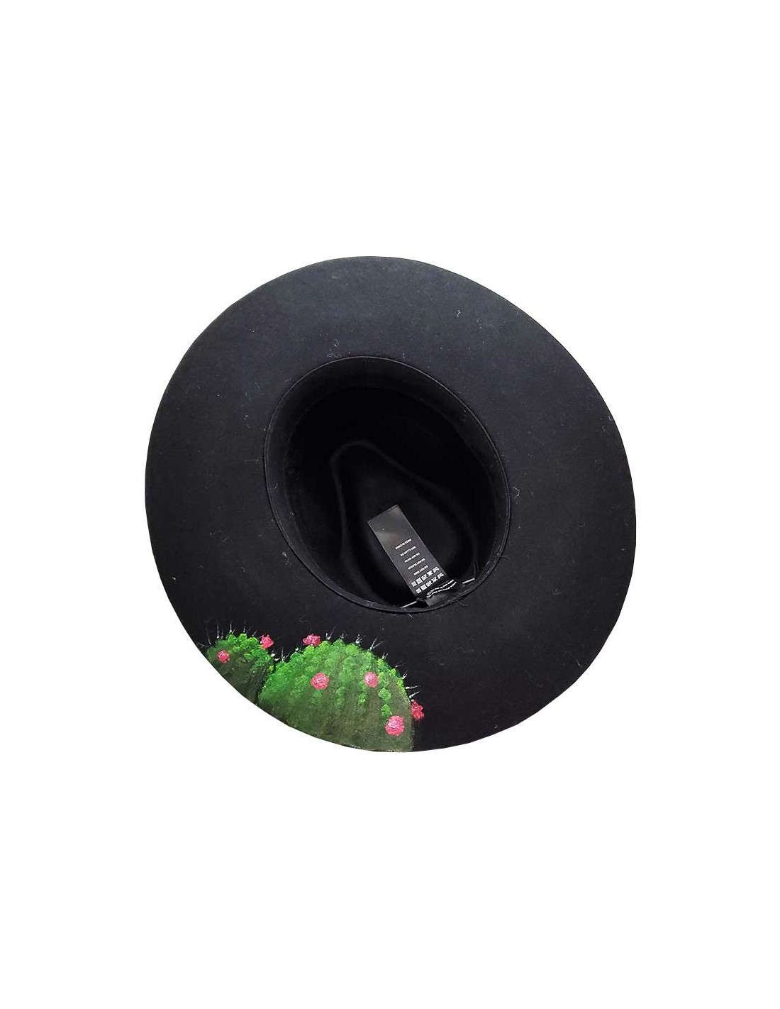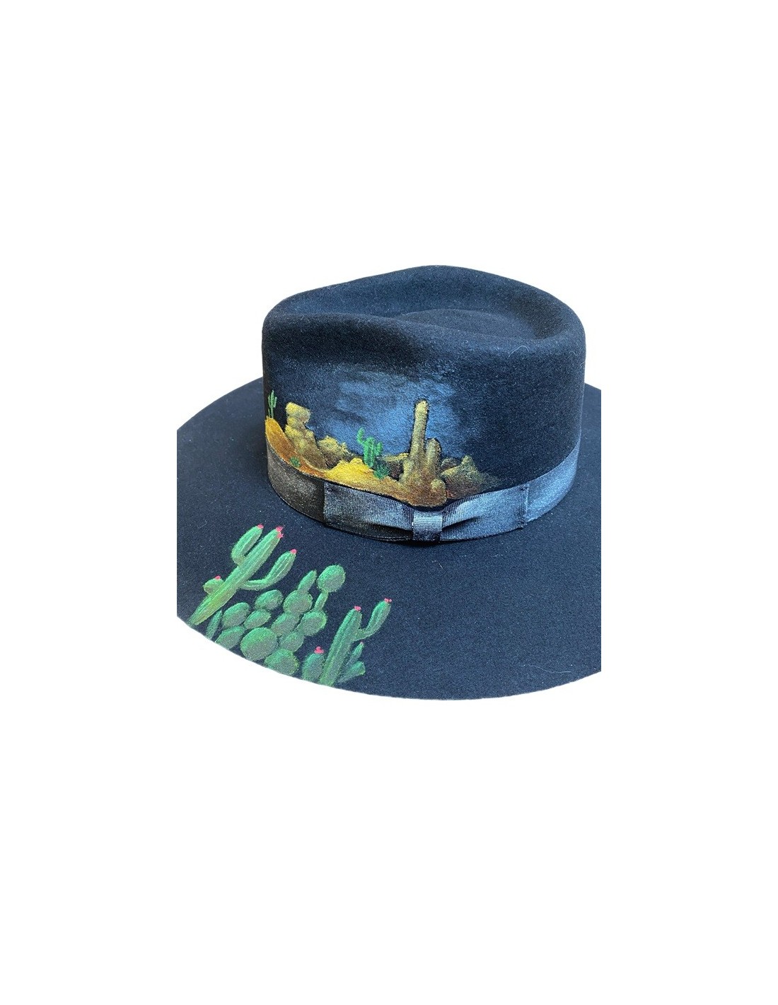 Hand-customized bogart hat for a unique look. Painted with cactus blossoms and Far West decor on the brim and side, it gives a chic and original cowboy effect!