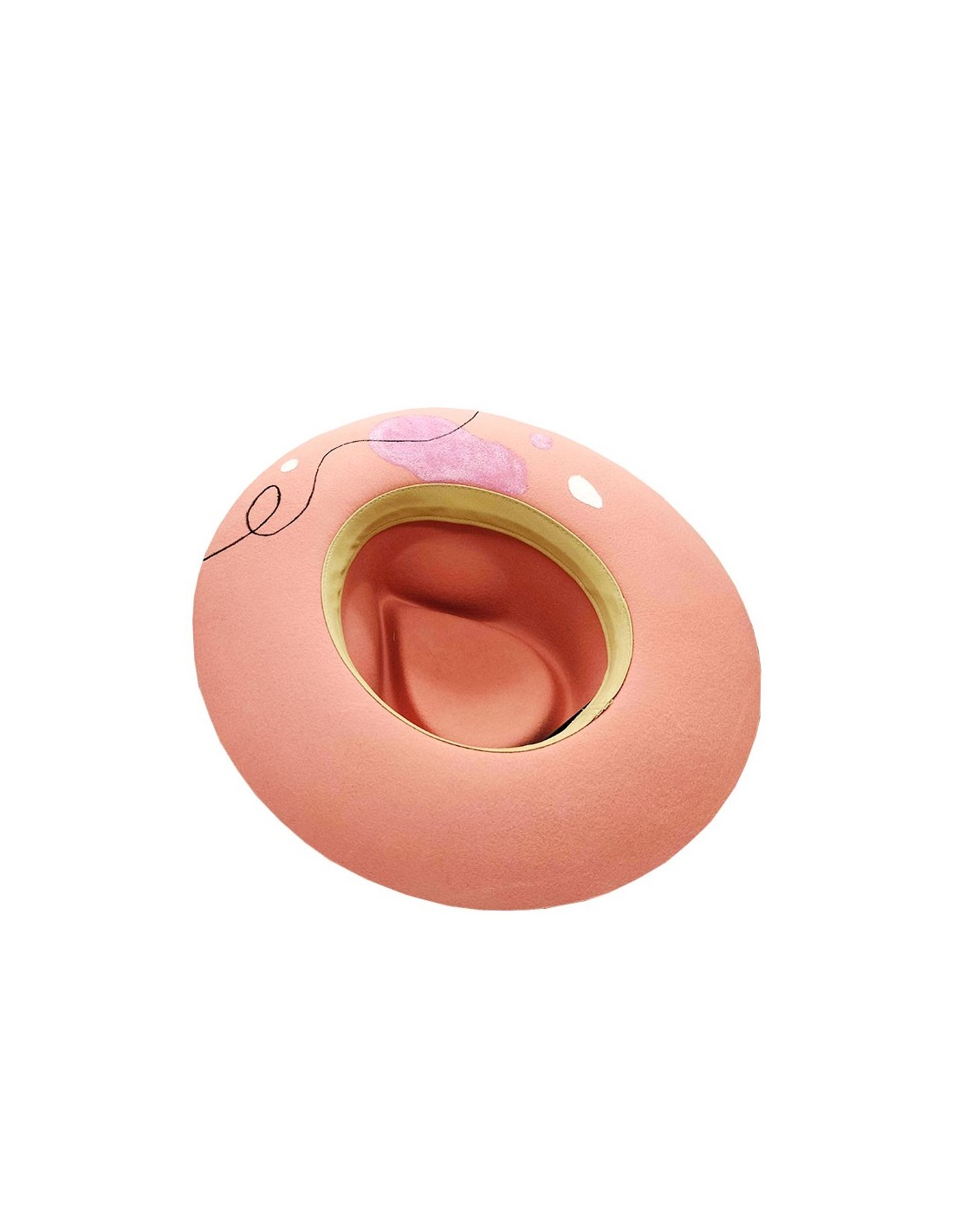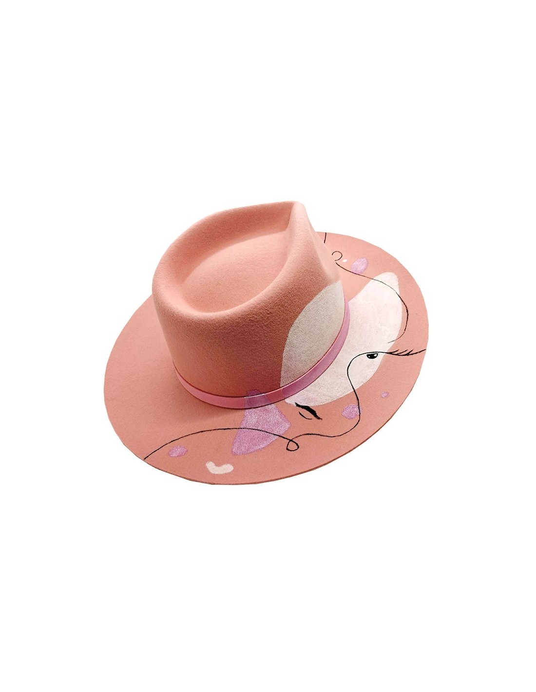 Hand-customized fedora hat in spring felt with wide candy pink brim, painted with several metallic pink and white solid colors, elegant black curves and lines suggesting a feminine face. Decorated with a pink suede tongue and 3 gray squares.