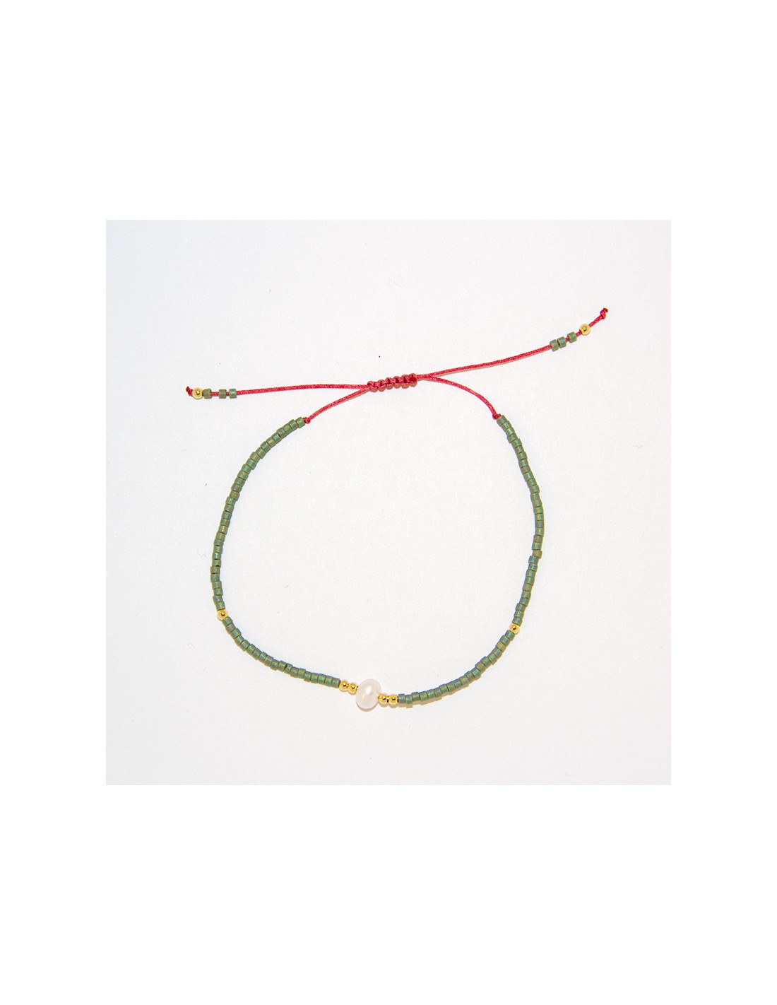 This delicate and fine bracelet is adorned in its center with a real mother-of-pearl pearl, itself encircled by golden pearls that highlight it. Other golden pearls elegantly dot the thread of the bracelet and its ends like luminous touches to brighten the whole. The macramé knot echoes the mother-of-pearl bead and the fluttering threads with four pearls add a light and subtle touch.