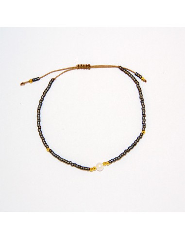 This delicate and fine bracelet is adorned in its center with a real mother-of-pearl pearl, itself encircled by golden pearls that highlight it. Other golden pearls elegantly dot the thread of the bracelet and its ends like luminous touches to brighten the whole. The macramé knot echoes the mother-of-pearl bead and the fluttering threads with four pearls add a light and subtle touch.