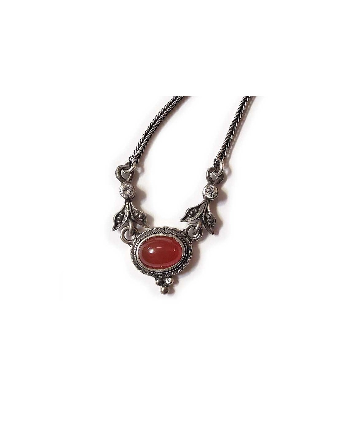 This necklace with tight and semi-rigid fancy links has a vintage style. The pendant is decorated with plant motifs with two white crystals and, in the center, an amber stone with a beautiful red-orange color.