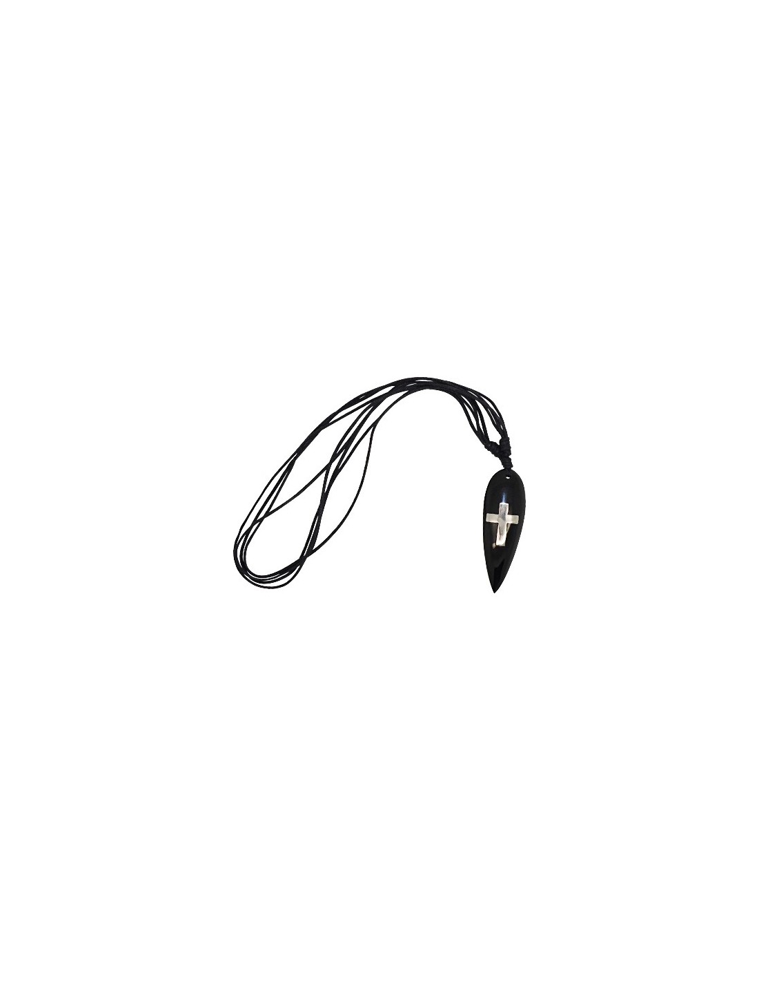 Adjustable cord necklace with surfboard or long point pendant. This pendant is made of resin, entirely by hand, and is inlaid with a silver Christian cross.