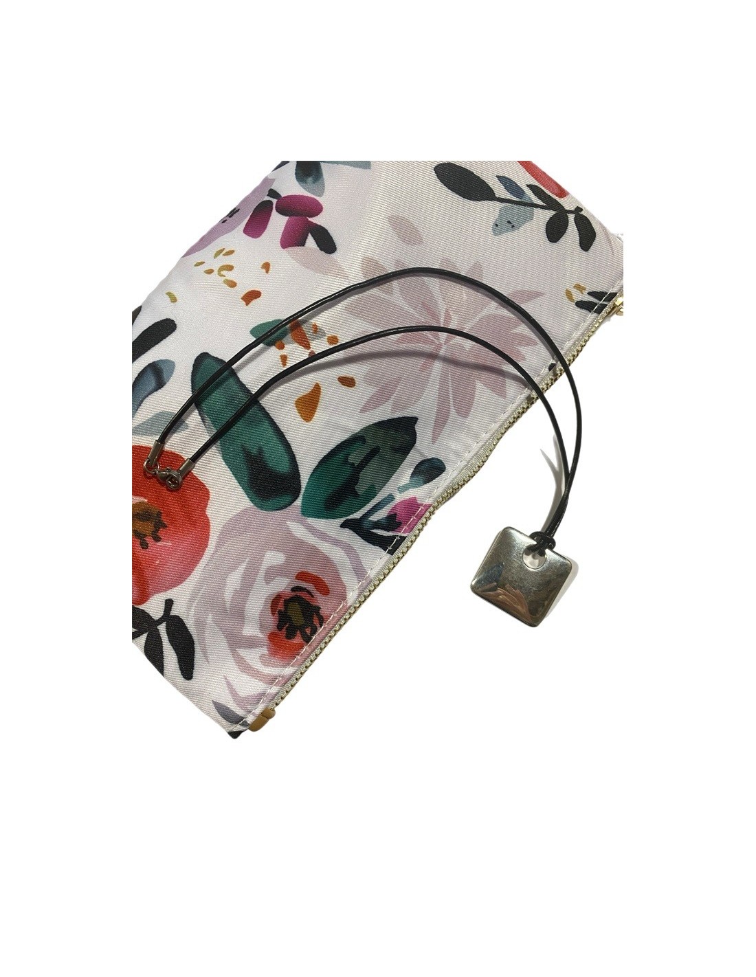 Essential oil bottle storage pouch with pretty, delicate and colorful floral patterns and adorned with a pom-pom, with zipper closure.