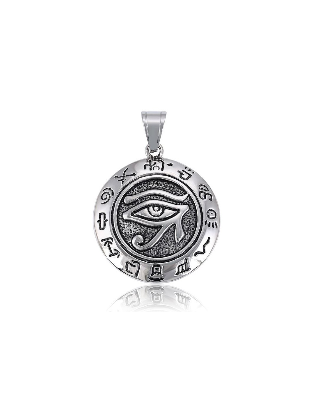 Stainless steel pendant with the symbol of the eye of Ra, a strong symbol of protection, surrounded by various other symbols.