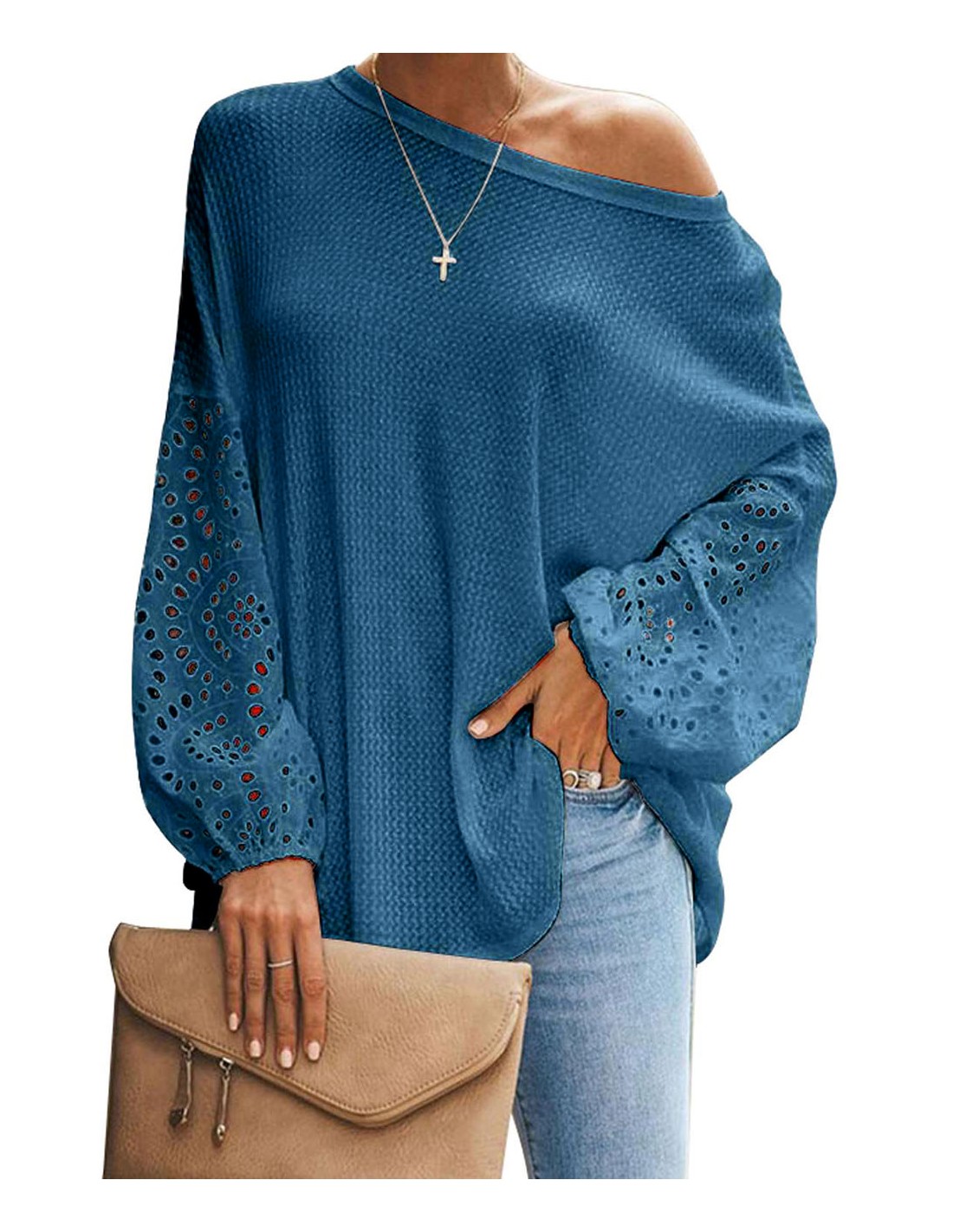 A loose blouse with a comfortable fit, it's beautifully decorated with broderie anglaise on its puffed sleeves.