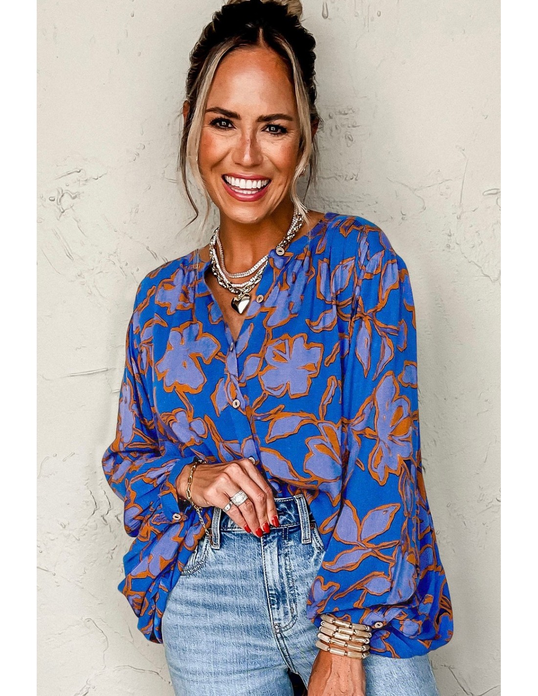 Blue Floral Print Batwing Sleeve Buttoned Loose Fit Shirt