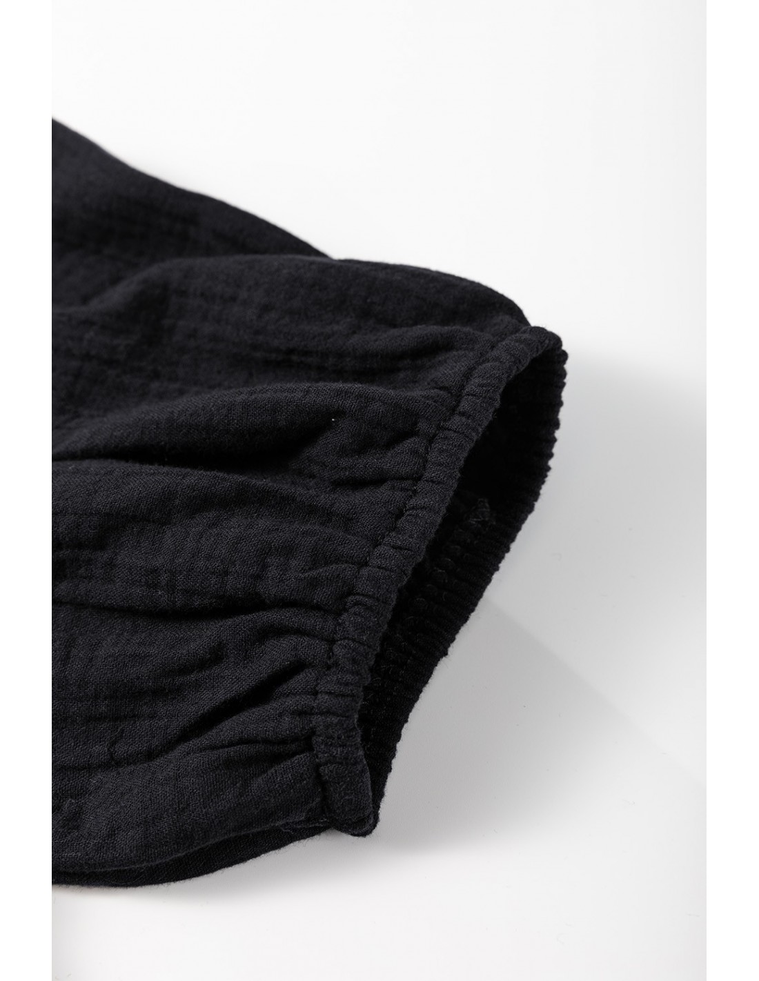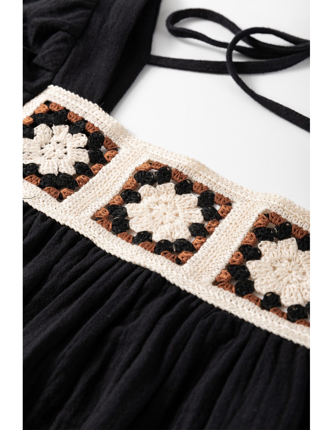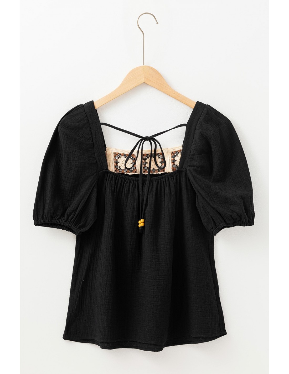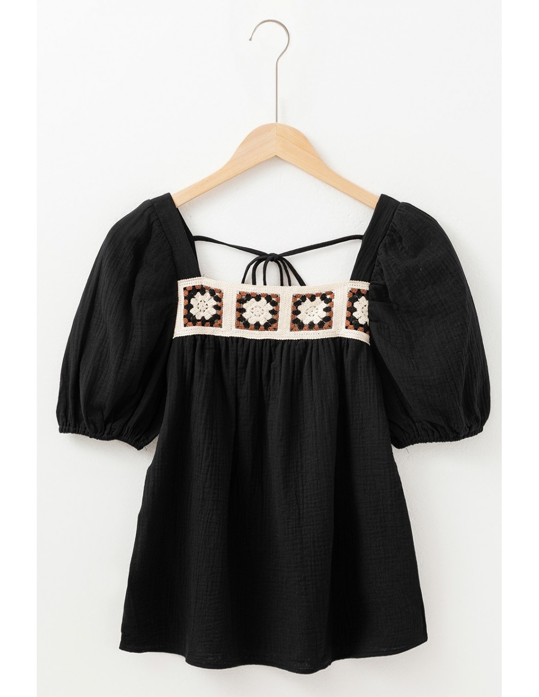 Black Flower Crochet Square Neck Textured Short Sleeve Blouse