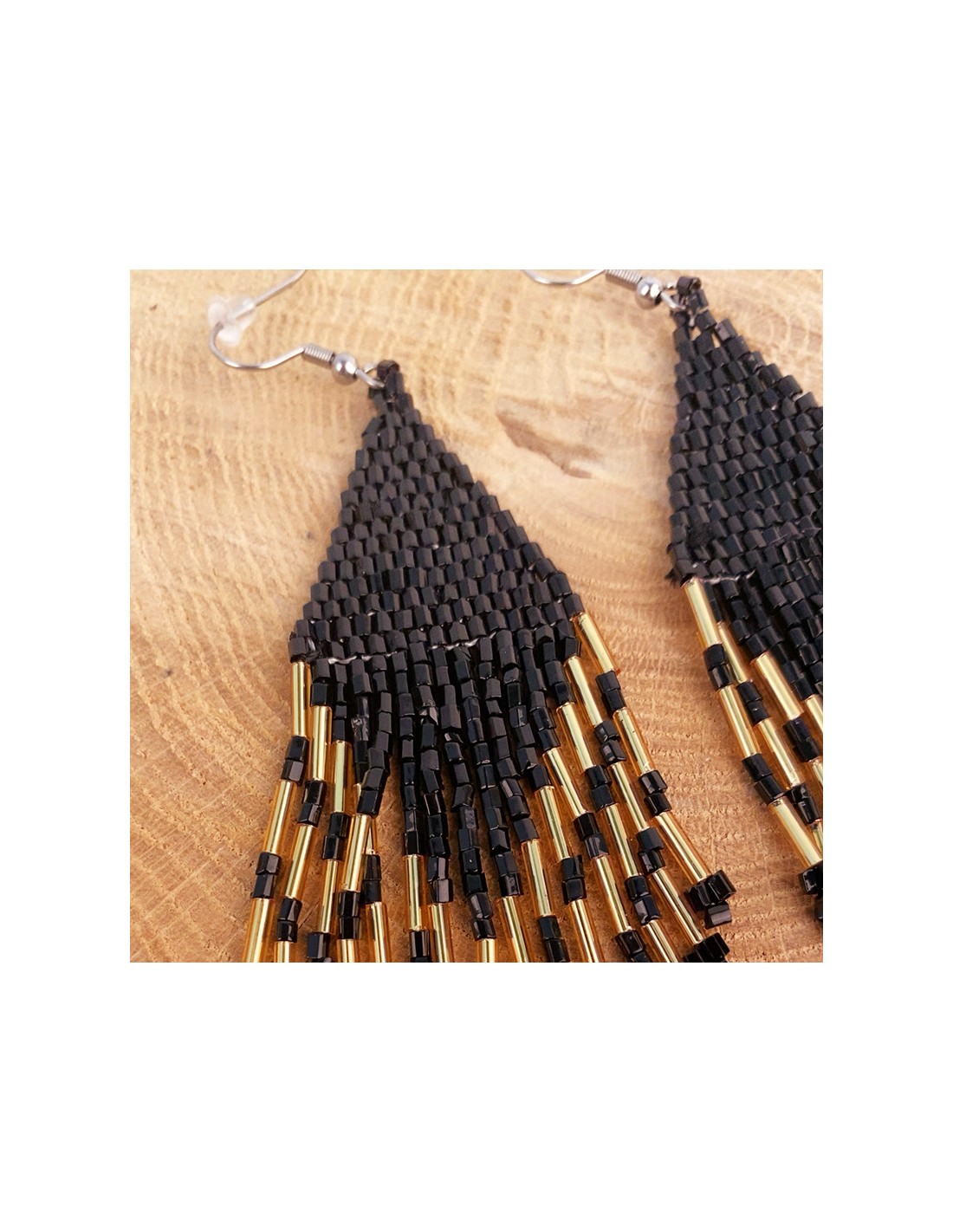 Boucles d'oreilles longues en perles miyuki dorées avec des variations de blanc et de noir. En forme de losanges, les fils de perles s'évasent et pendent librement, évoquant des plumes.