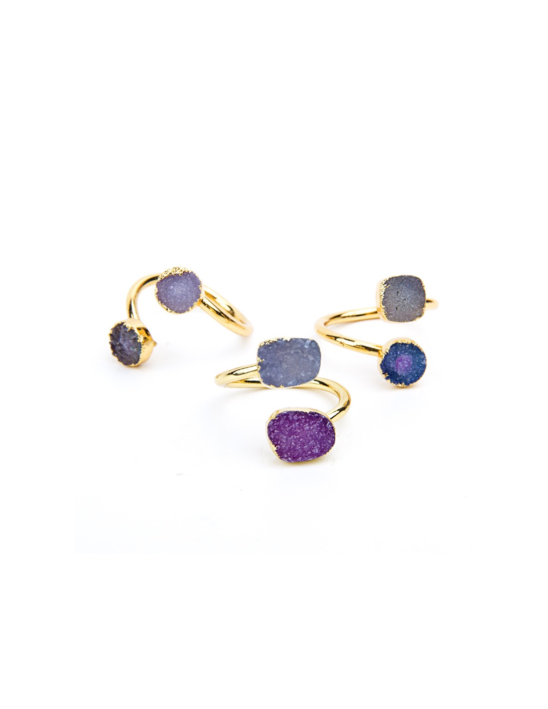 Bague avec deux pierres d'agate druzy, plaquée or. Le style est bohème et charmant, unique grâce aux pierres aux variantes de bleus, mauves et gris. La taille est ajustable (57 à 59 taille EU, 7 à 9 taille US).