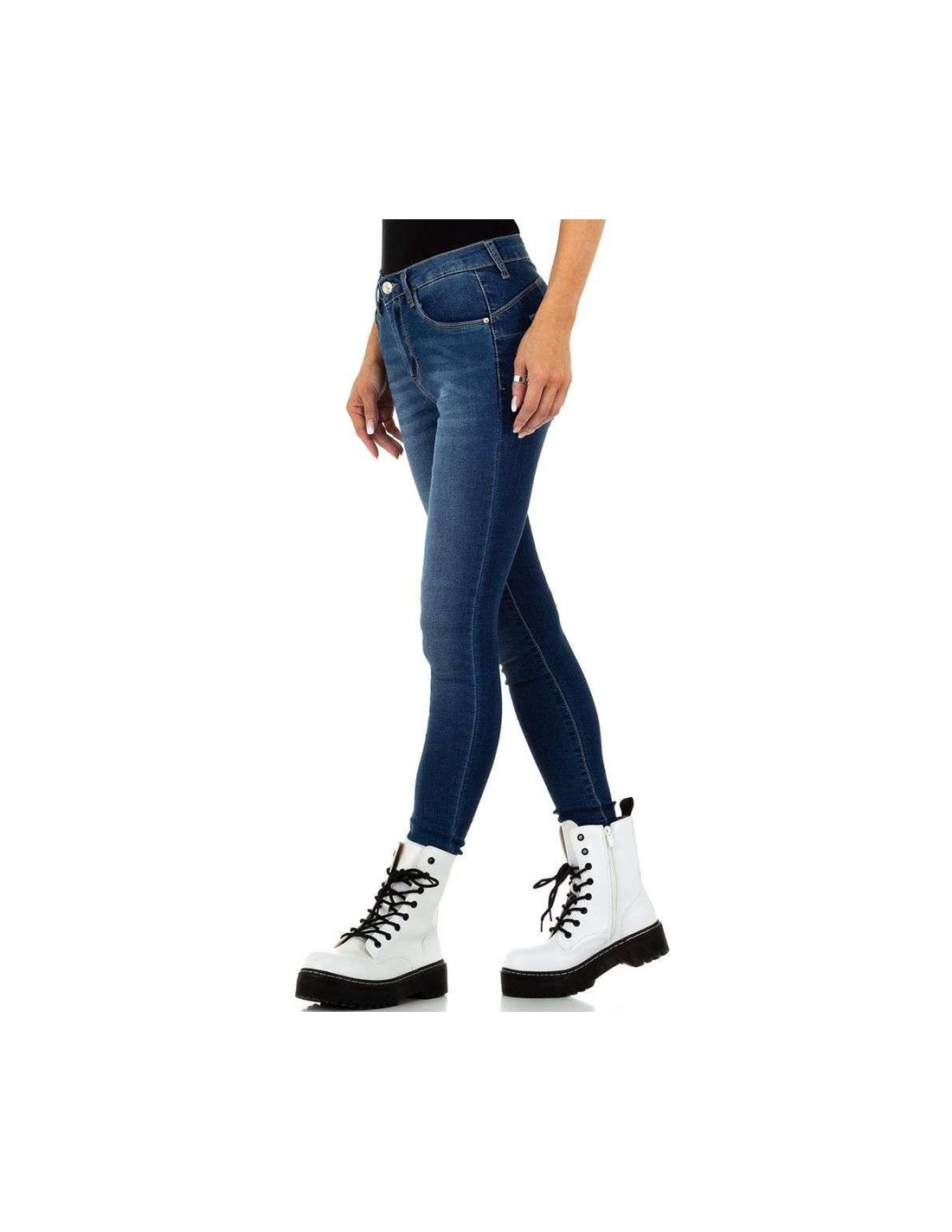 Pantalon jean moulant bleu foncé, aussi appelé Slim, à la coupe classique. Le jean se porte à taille haute et descend aux chevilles. Il est pourvu de poches à l'avant et à l'arrière.