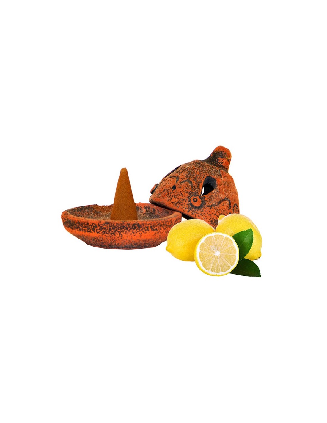 Boîte contenant 10 encens en cône parfum de citron et un support pour protéger et faire brûler le cône. Support en terre cuite, réalisé à la main.