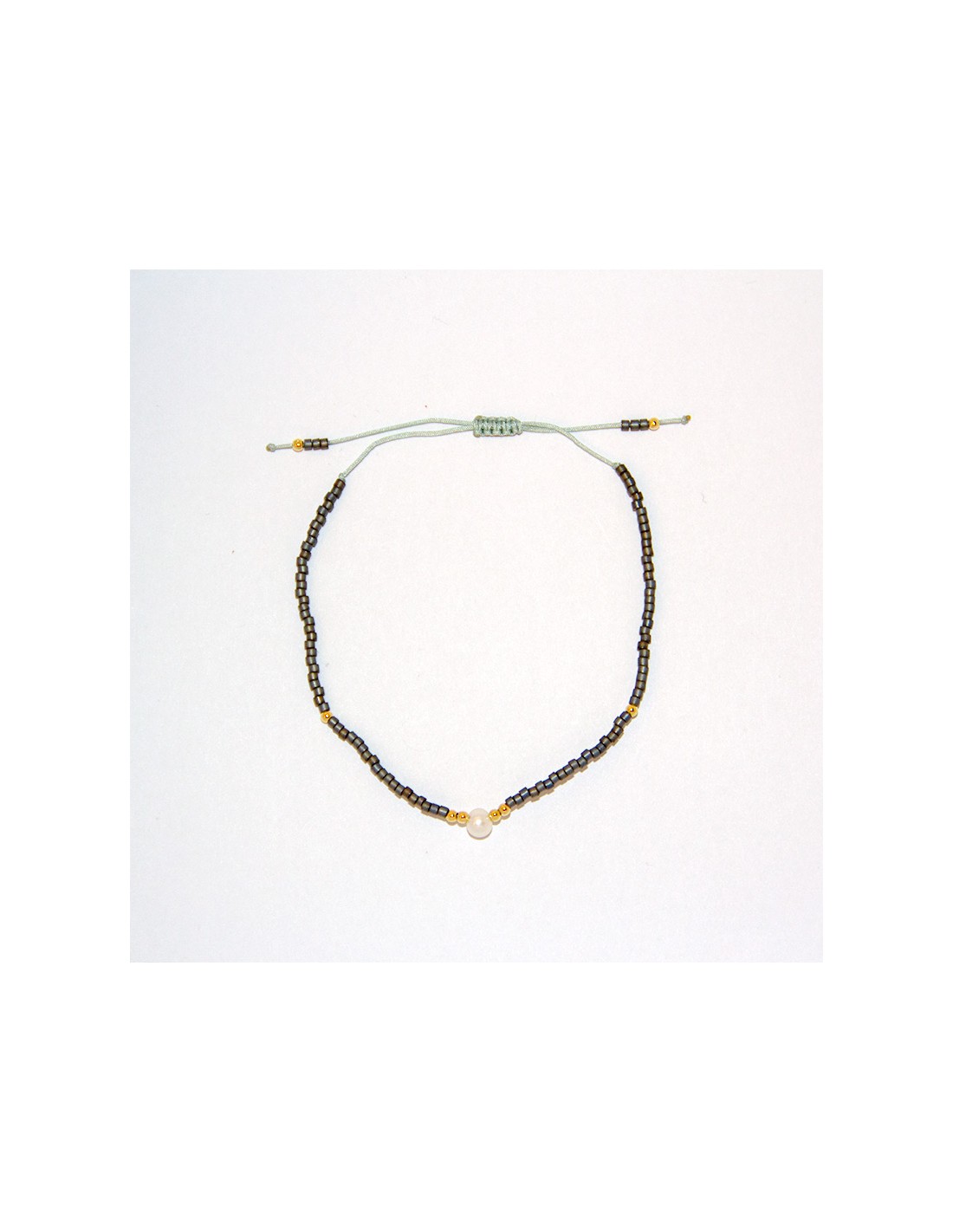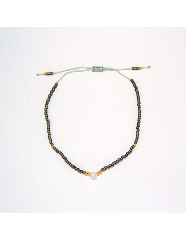 Ce bracelet délicat et fin est orné en son centre d'une véritable perle de nacre, elle-même encerclée par des perles dorées qui la mettent en valeur. D'autres perles dorées parsèment élégamment le fil du bracelet et ses extrémités telles des touches lumineuses pour égayer l'ensemble. Le nœud en macramé fait une sorte d'écho à la perle de nacre et les fils volants agrémentés de quatre perles ajoutent un côté léger et subtil.