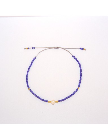Ce bracelet délicat et fin est orné en son centre d'une véritable perle de nacre, elle-même encerclée par des perles dorées qui la mettent en valeur. D'autres perles dorées parsèment élégamment le fil du bracelet et ses extrémités telles des touches lumineuses pour égayer l'ensemble. Le nœud en macramé fait une sorte d'écho à la perle de nacre et les fils volants agrémentés de quatre perles ajoutent un côté léger et subtil.