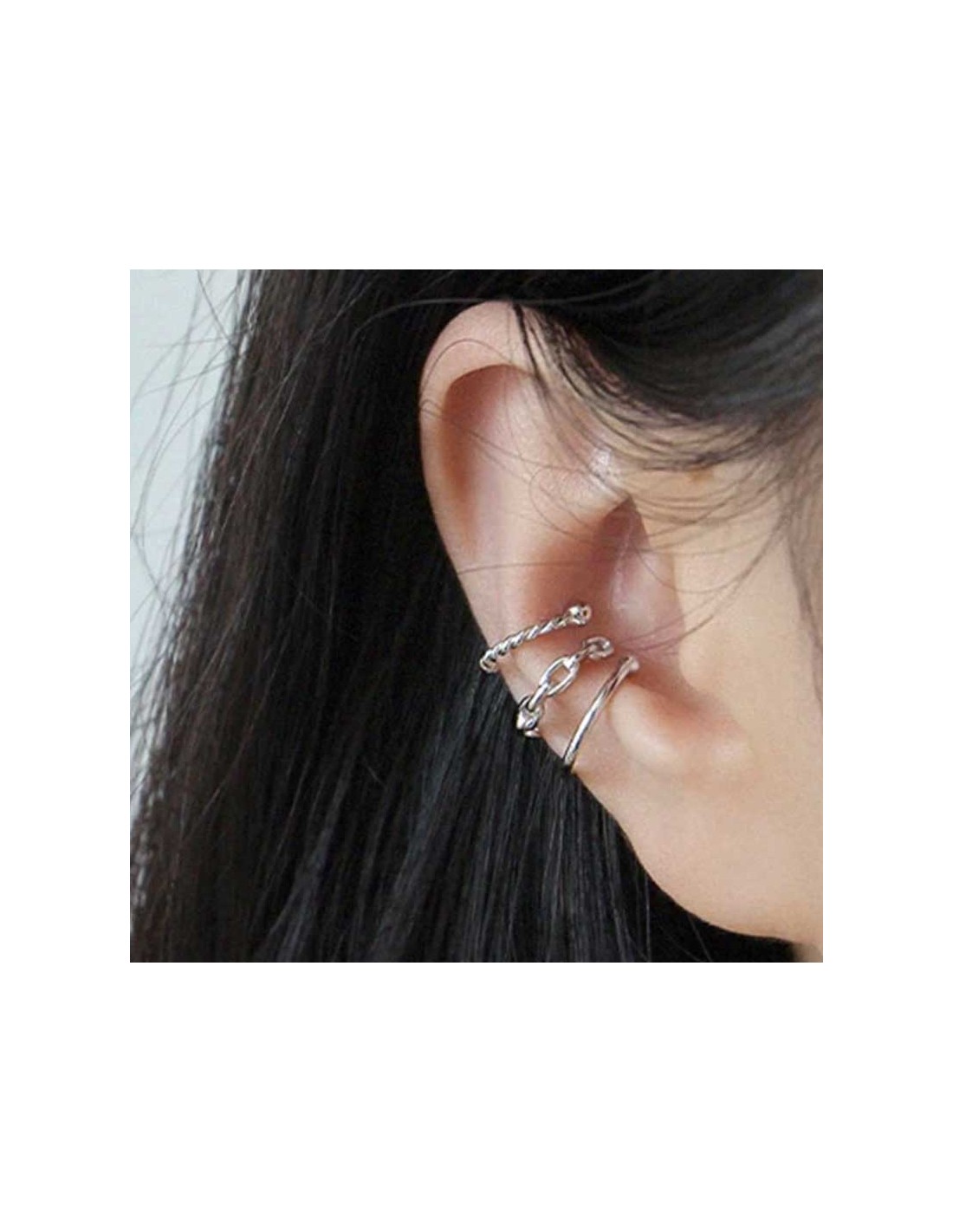 Cet ensemble de quatre boucles d'oreille sans trou en argent 925 s'enfilent autour de l'oreille sans avoir à la percer ! Calées à l'hélix du pavillon, elles apportent une touche extravagante et esthétique. Chaque anneau est différent : un simple, un tressé, un en chaîne et un dernier à deux bandes. À vous de choisir le style que vous préférez en portant le nombre d'anneaux que vous avez envie.